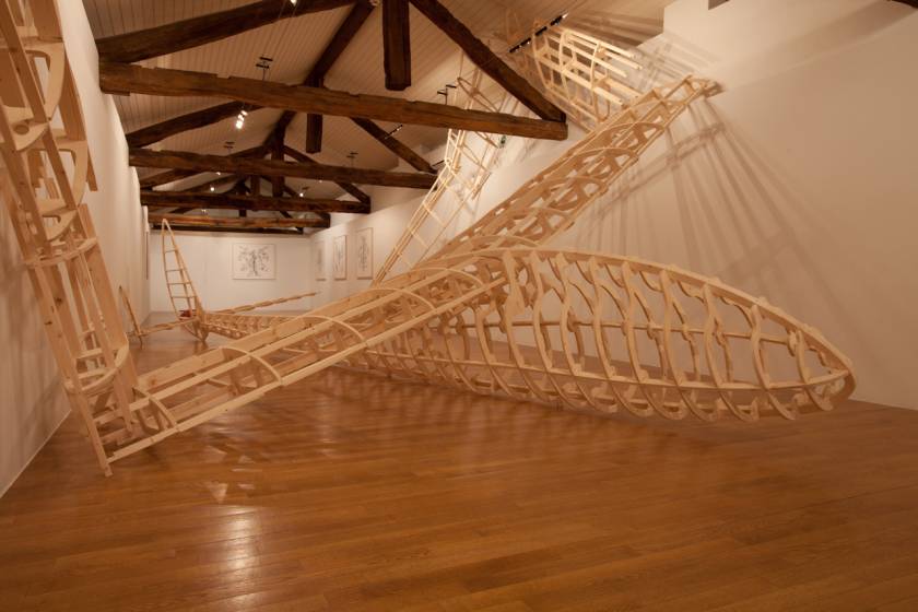 Name of a dragon in Norse mythology, Fafnir is also the name of a glider that was constructed in wood in Germany in the 1930s. Since, at one point, it was launched with an elastic at the top of the Jungfrau in Switzerland. The aerodynamic aircraft – recreated by enlarging a model to its original scale – is 20 meters wide and recalls the refined elegance of design of its time. In a precarious attempt to land inside a narrow confinement of a building, the structure has undergone an unfortunate contortion causing disfigurement and entrapment like a poor insect that either outgrew the space or got stuck in a hole too small to free itself.