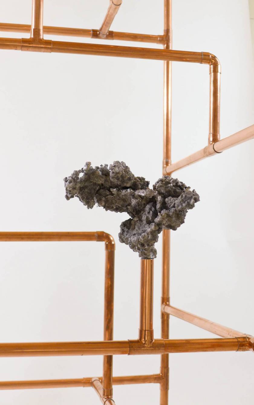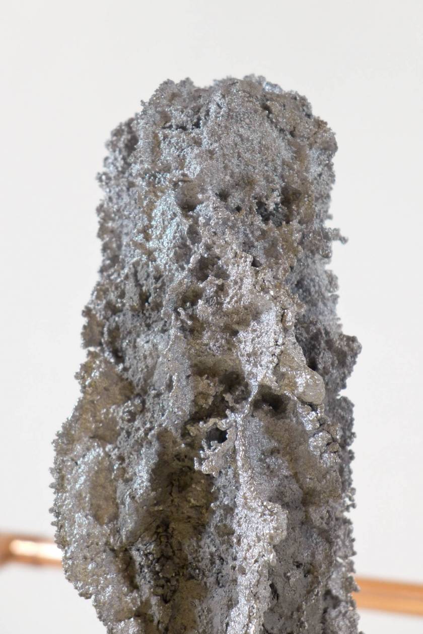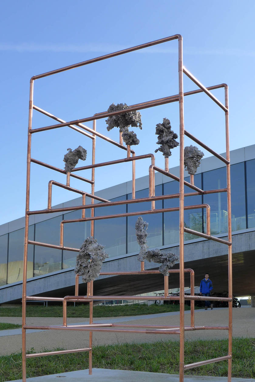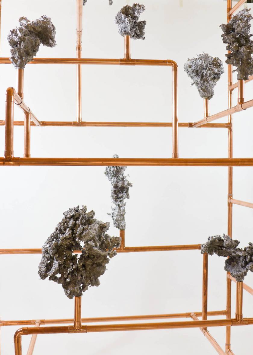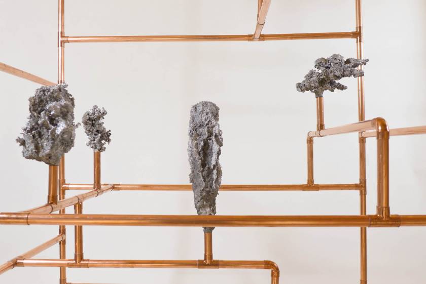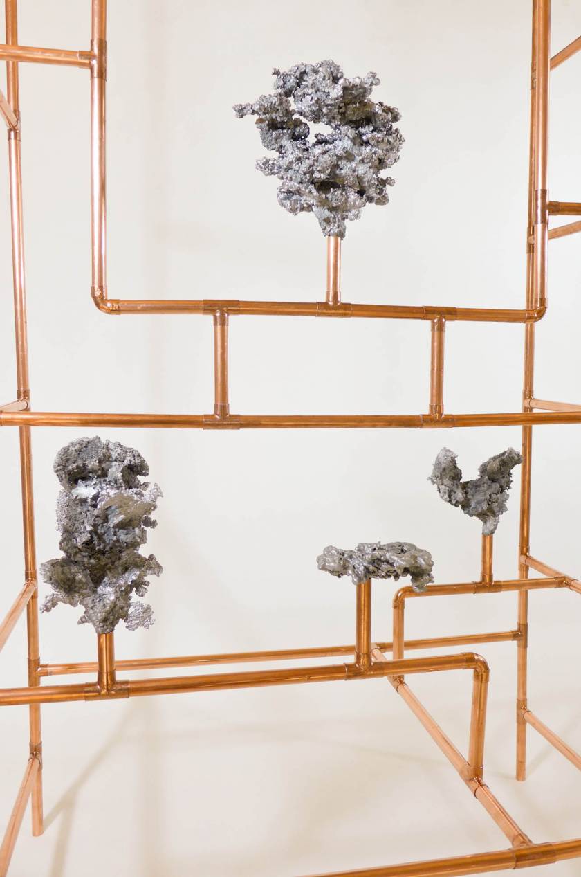 Looking for the origin of natural forms, Gonzenbach tries to materialize the propagation of a liquid by casting melted aluminum into different sands. The petrified clouds of metal are presented in Chinese cabinet shaped copper tubular structures.
