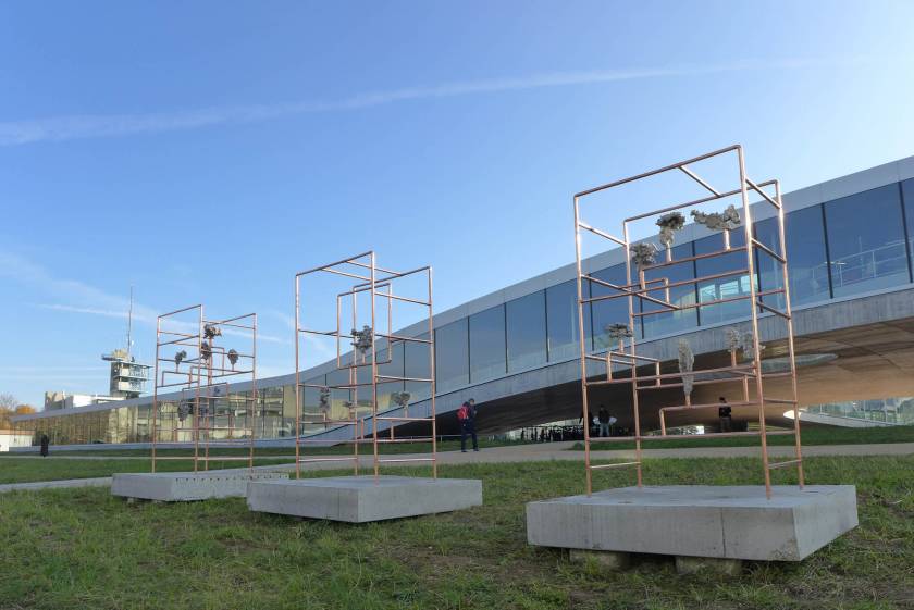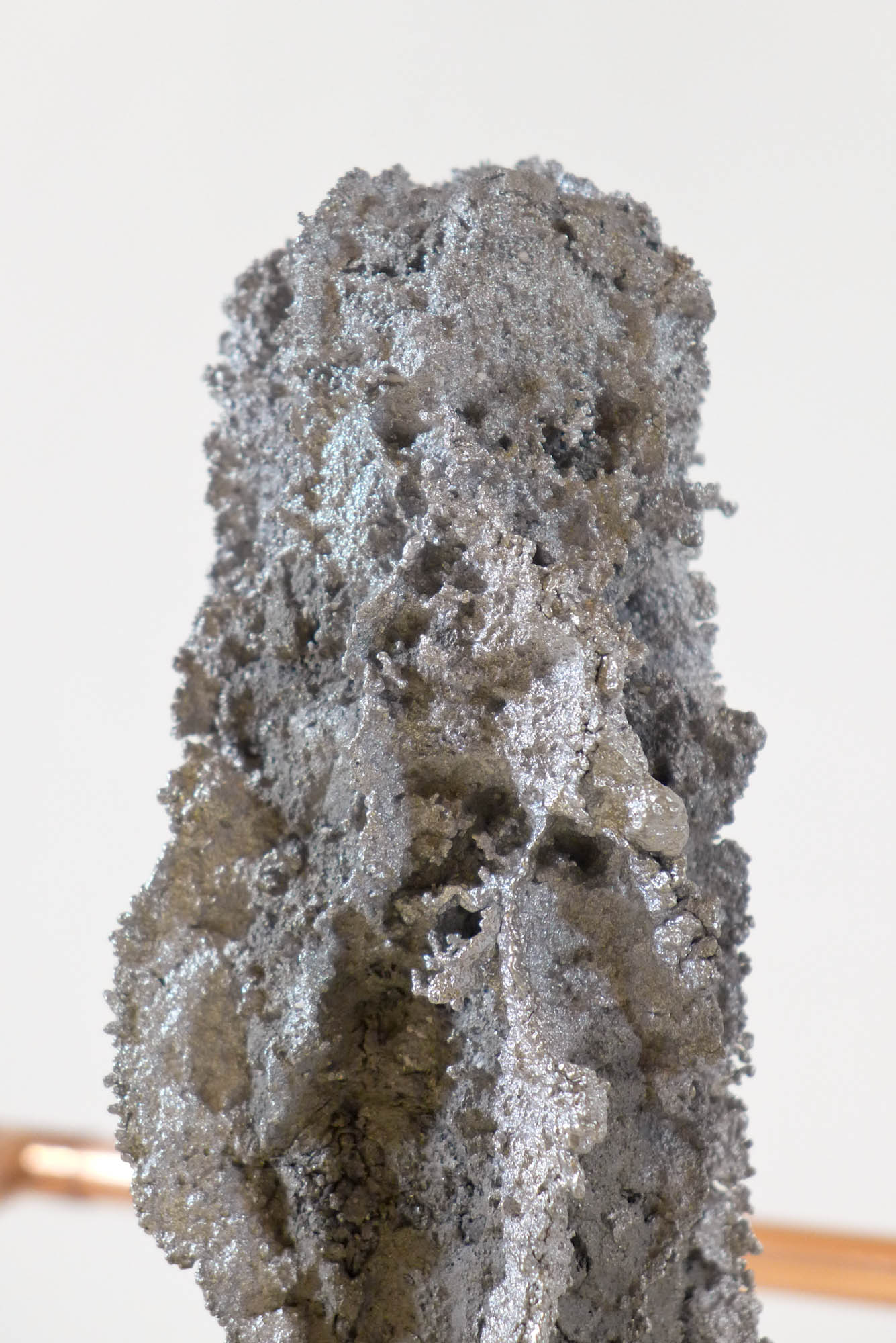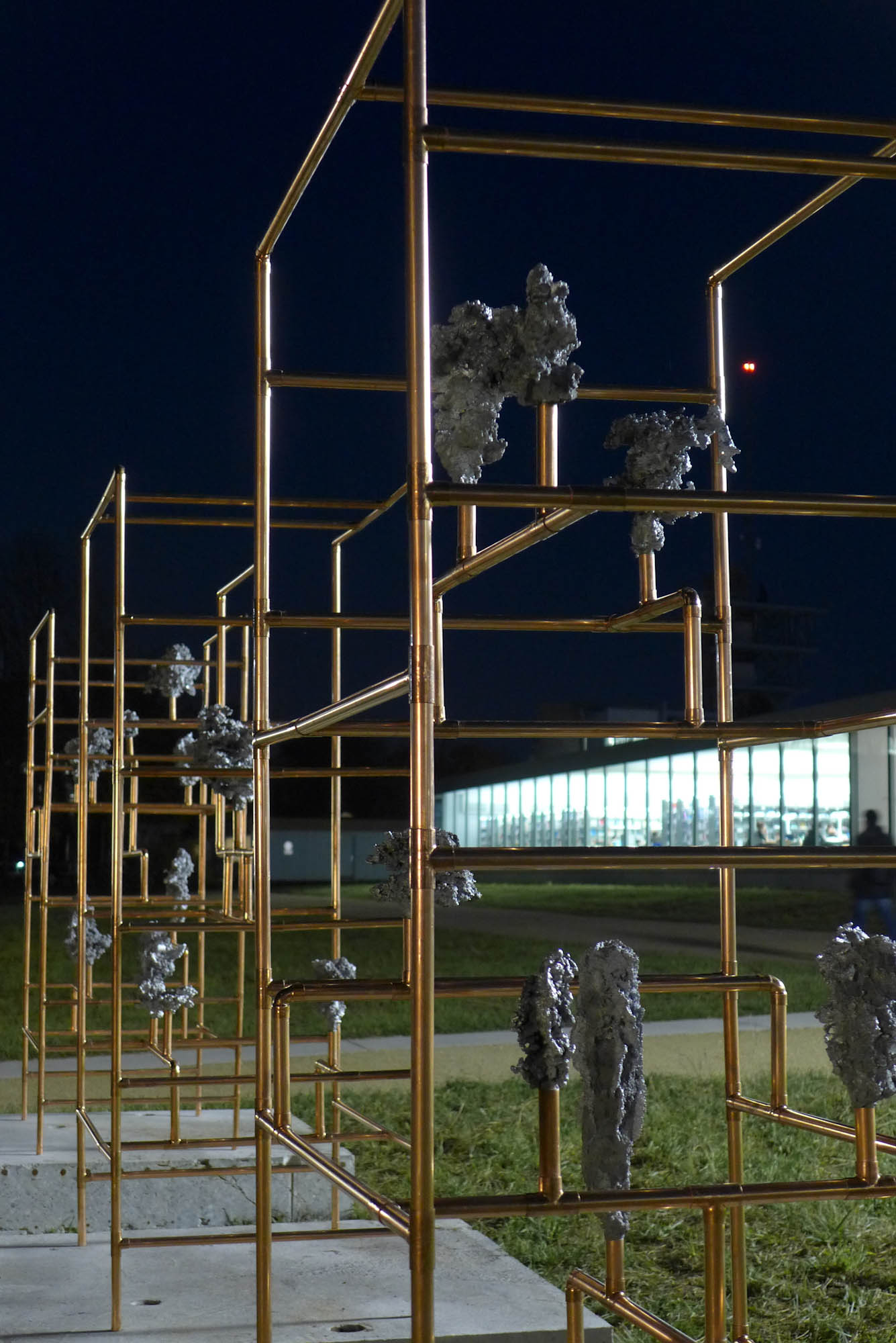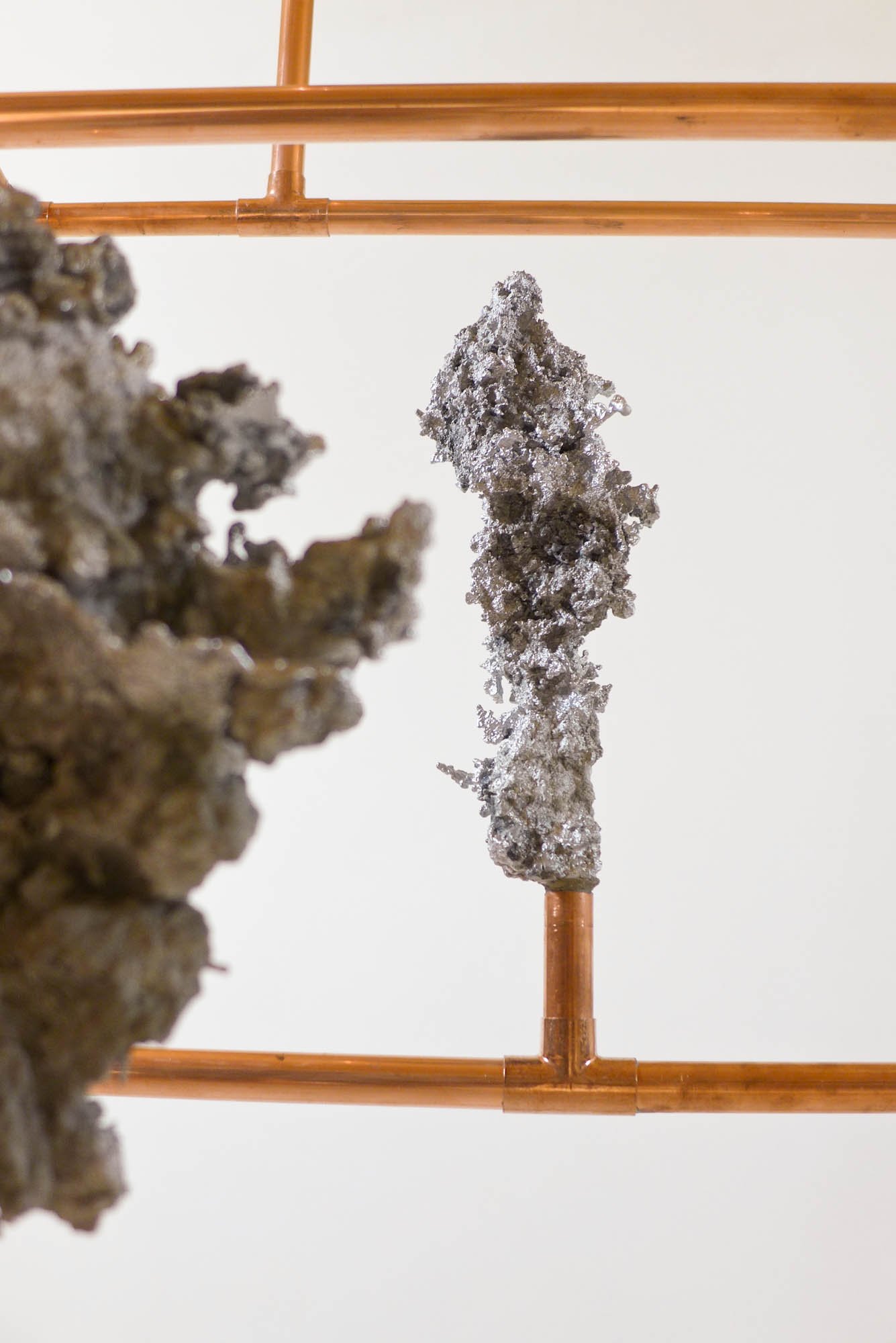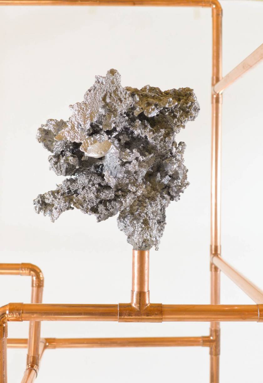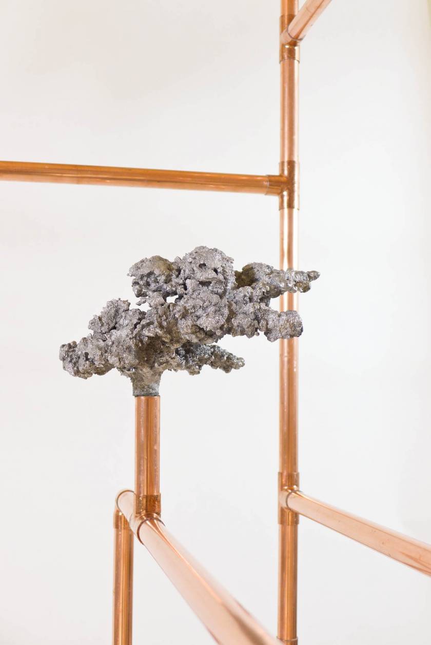 Looking for the origin of natural forms, Gonzenbach tries to materialize the propagation of a liquid by casting melted aluminum into different sands. The petrified clouds of metal are presented in Chinese cabinet shaped copper tubular structures.