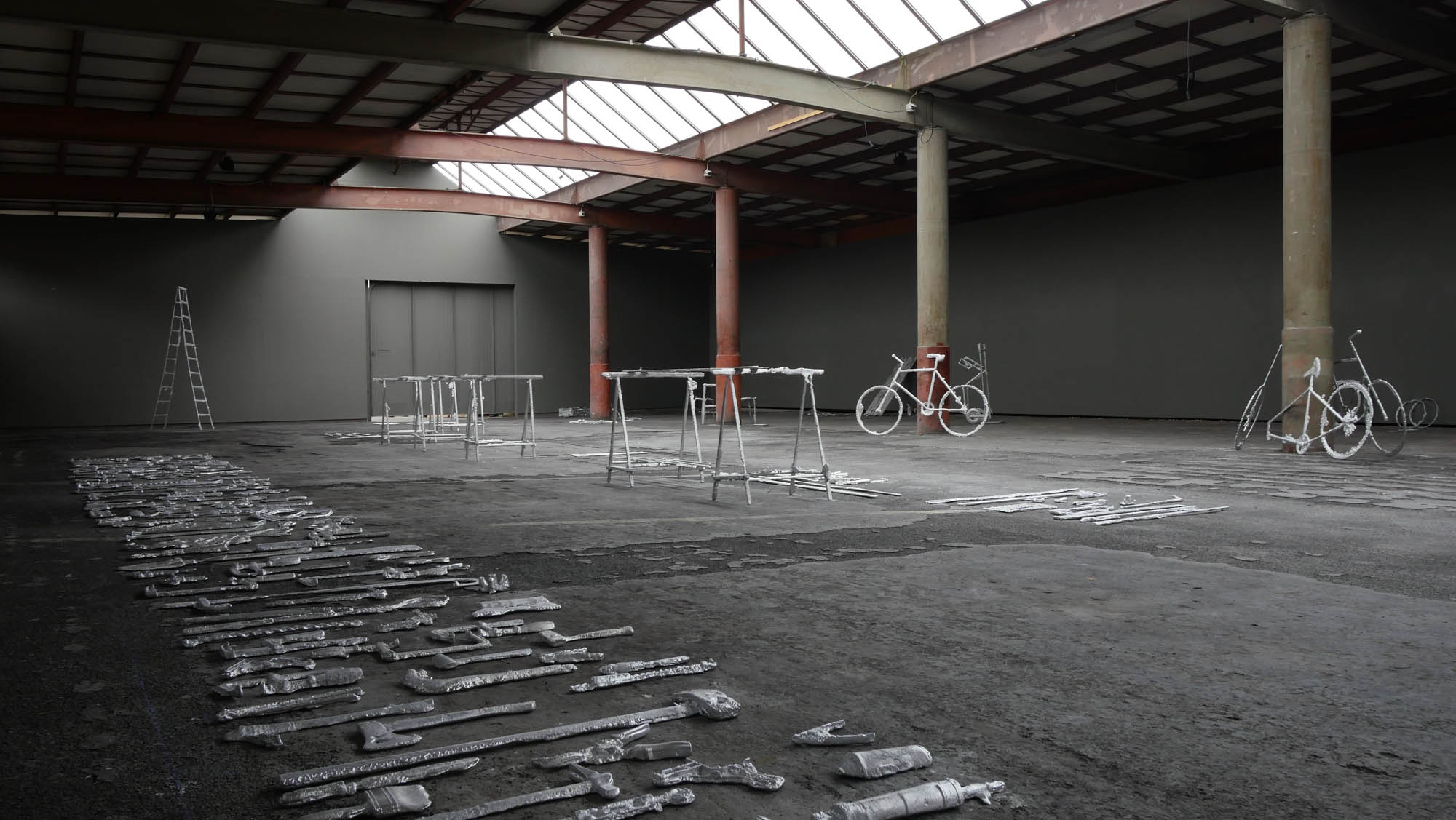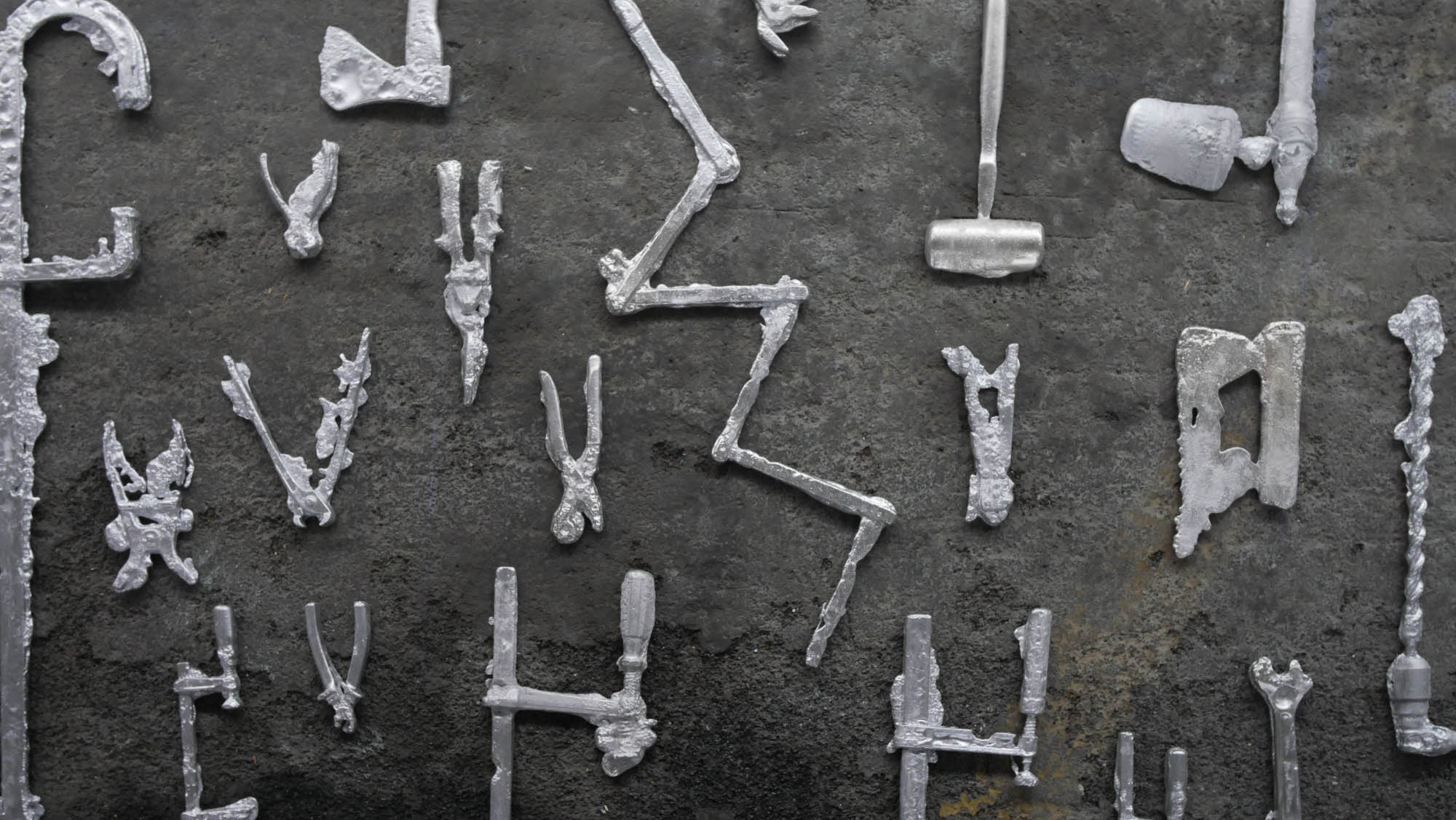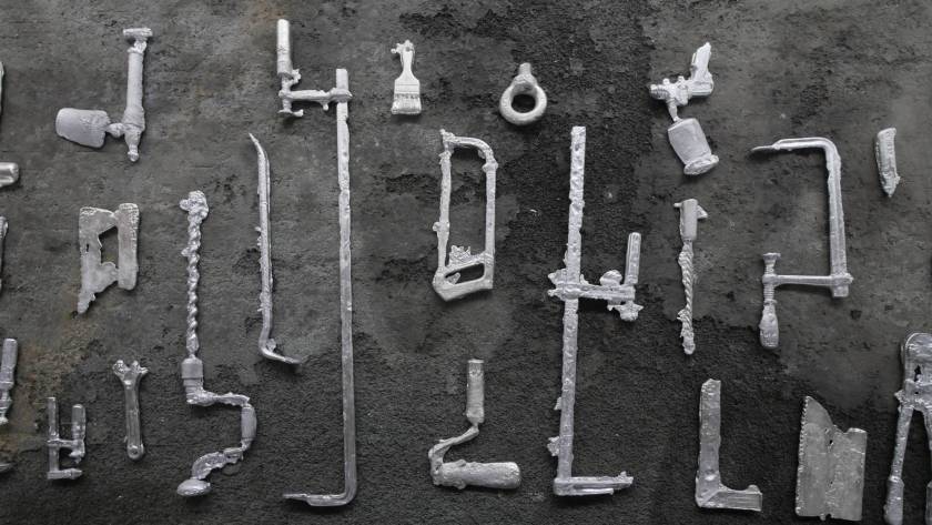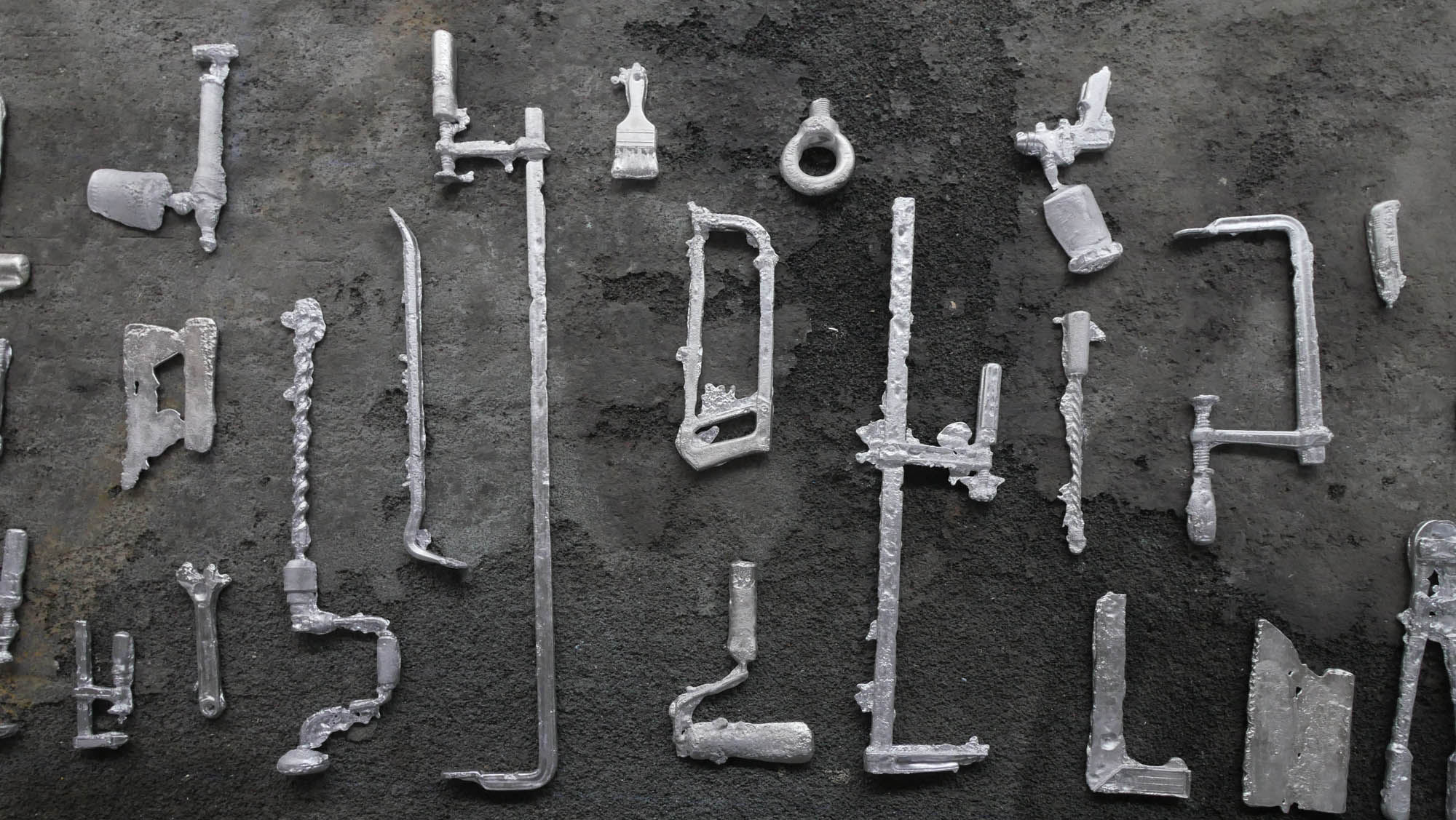 Then he heats the furnace, melting aluminum. With liquid aluminum, he carefully fills the imprints in the sand. Remaking those lost objects is like summoning ghosts. The ghosts of the tools, the ghosts of the workshop.