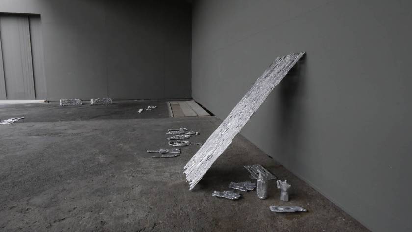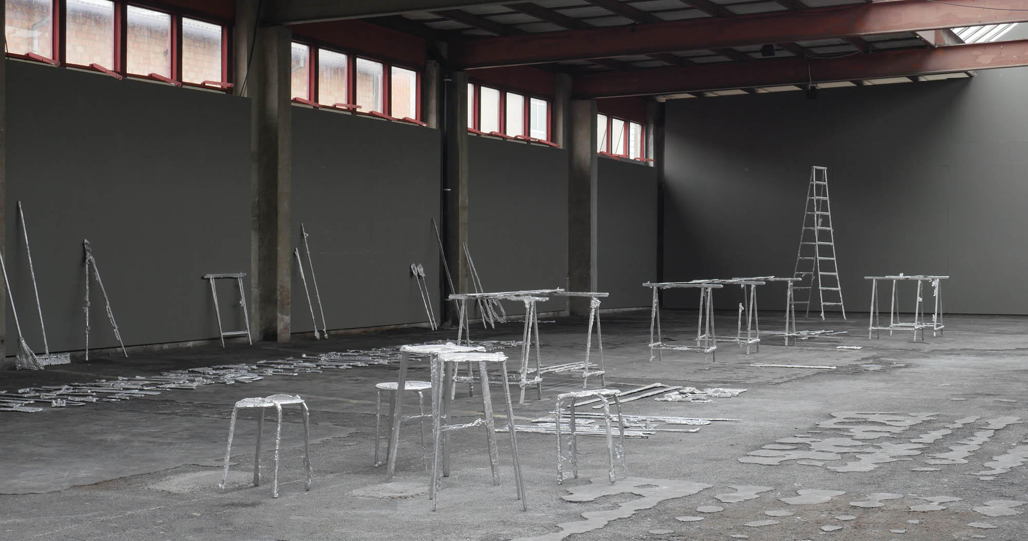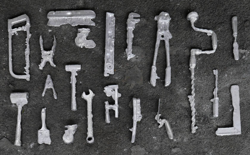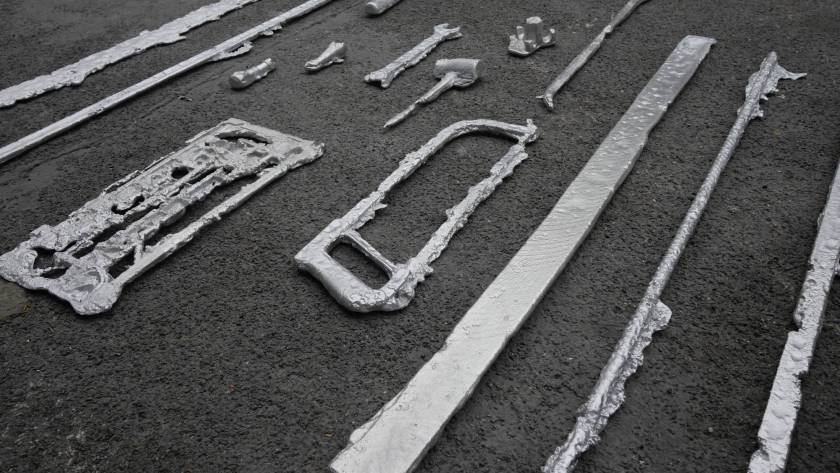 Little by little new shapes appear, first single objects, mainly tools. Then, from those ghost tools, he makes more complex imprints, making more complex objects.