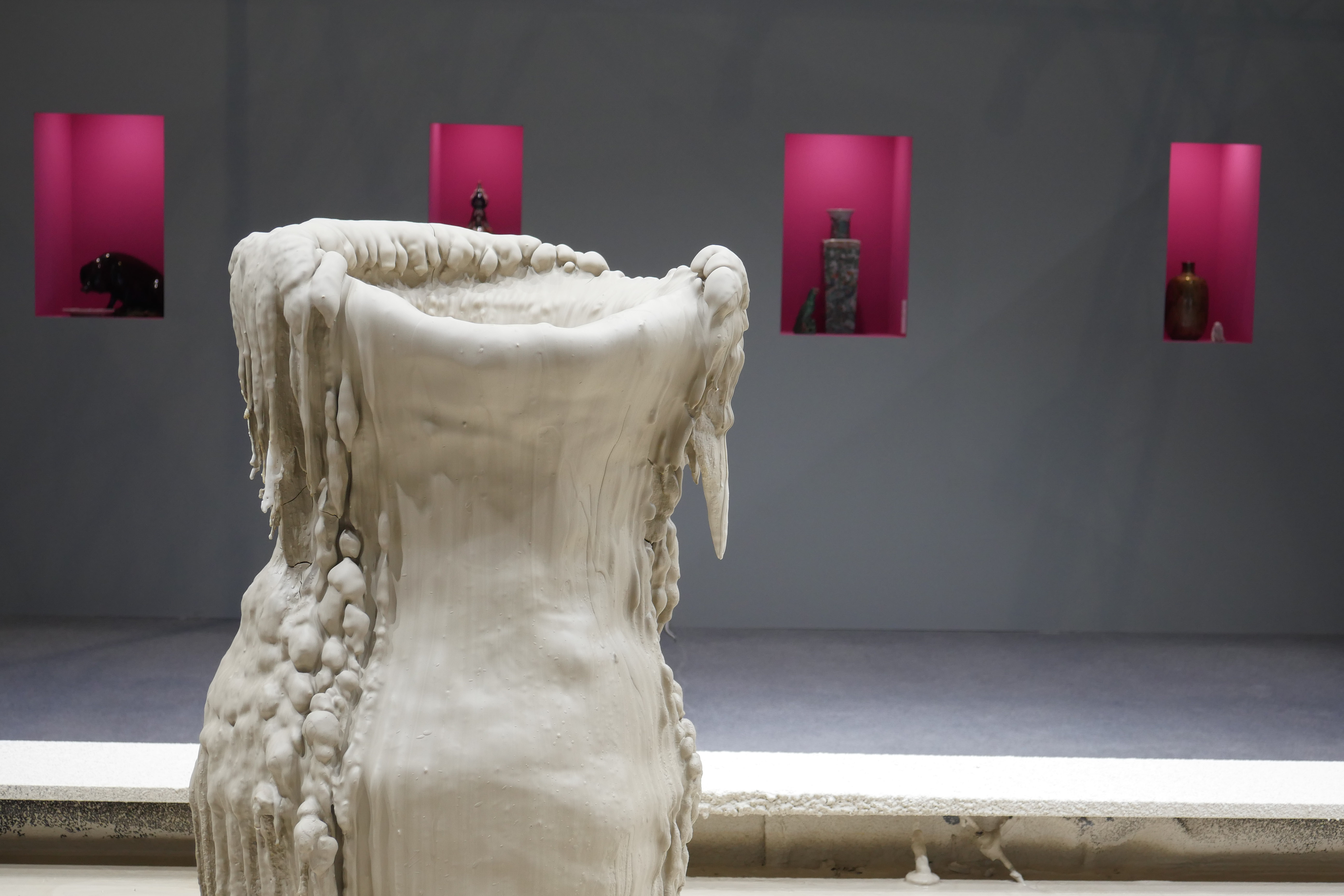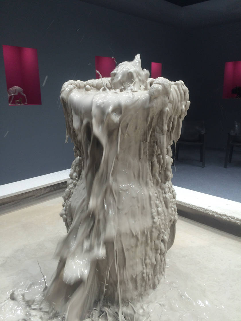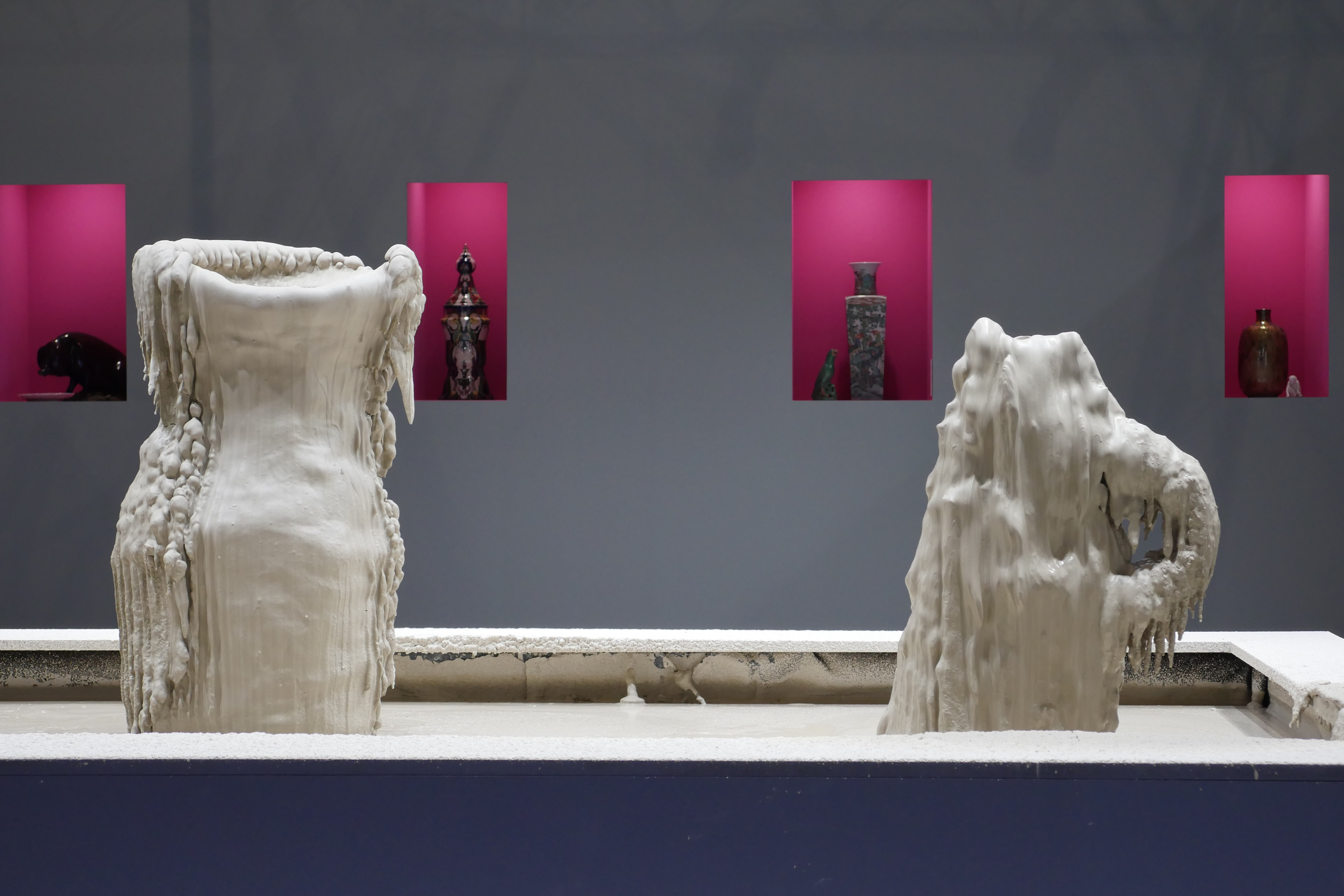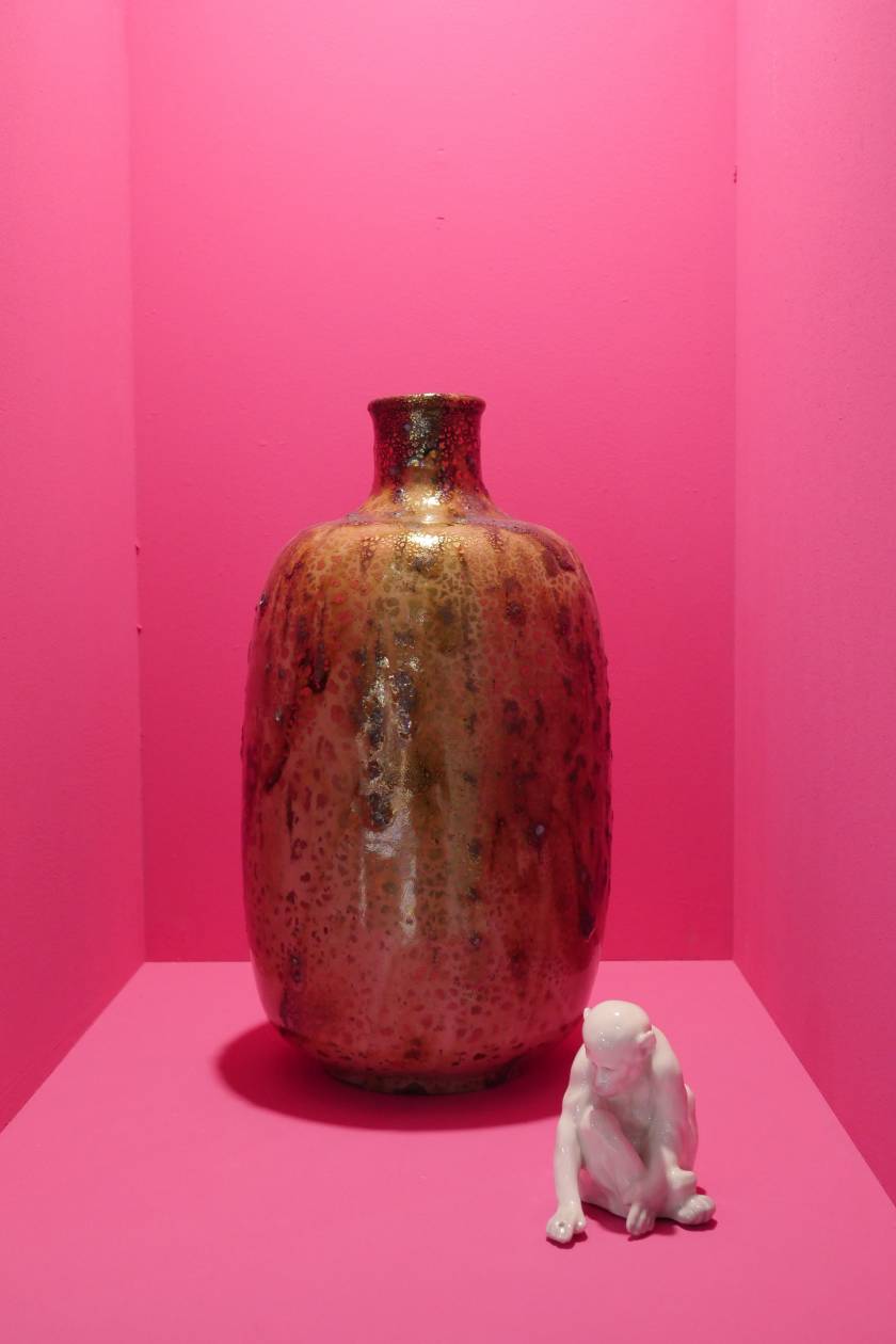 Invited by Ariana Museum to conceive and realize their booth for the contemporary art fair, Artgenève, Christian Gonzenbach selected two dozen of pieces in their archiv and installed them into pink wall boxes. In the center of the booth, a fountain made of porcelain mud spits every few minutes. The liquid clay mades two figures grow, a vase and a jug.