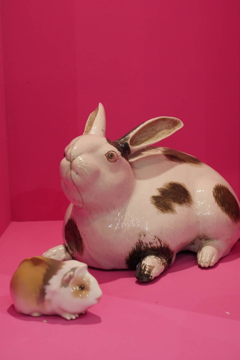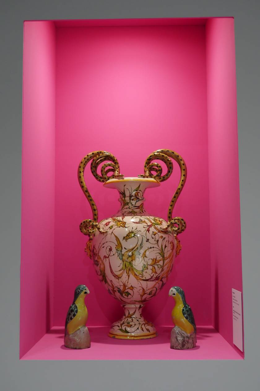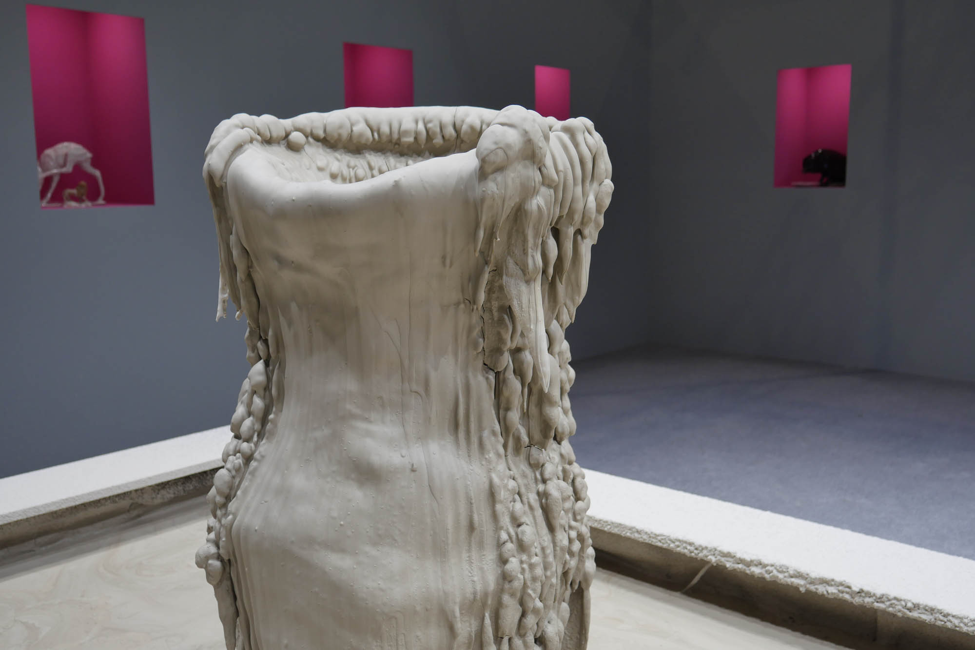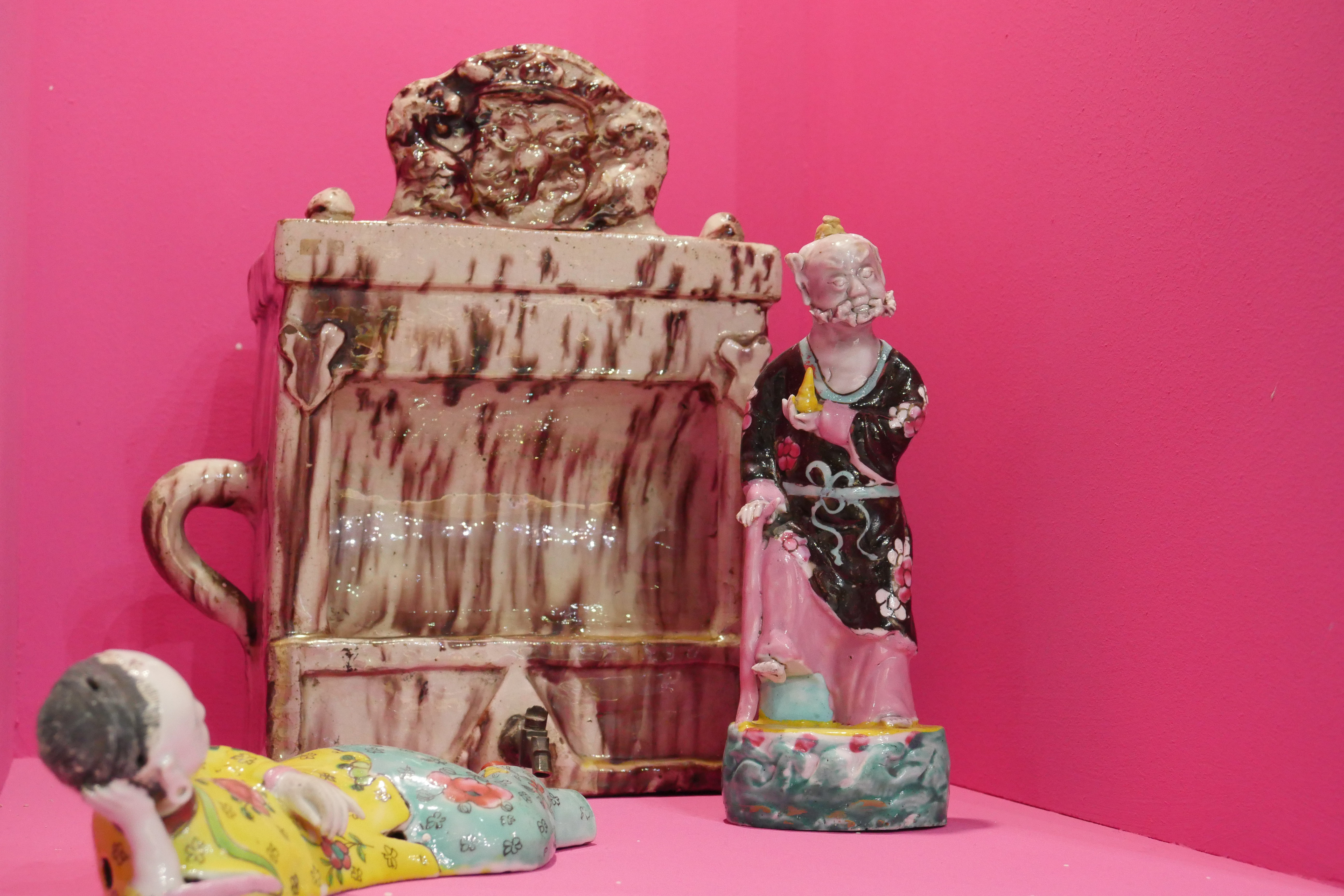 Invited by Ariana Museum to conceive and realize their booth for the contemporary art fair, Artgenève, Christian Gonzenbach selected two dozen of pieces in their archiv and installed them into pink wall boxes. In the center of the booth, a fountain made of porcelain mud spits every few minutes. The liquid clay mades two figures grow, a vase and a jug.