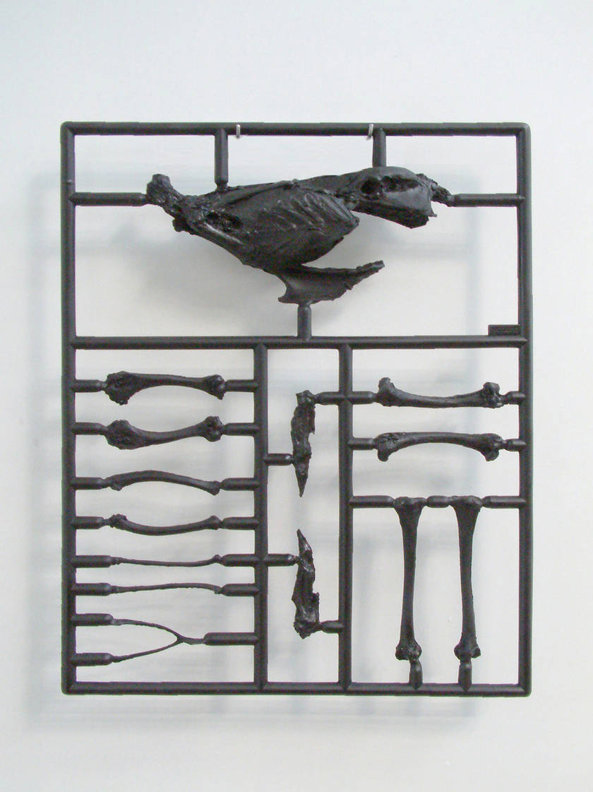 Like a model kit, a chicken’s anatomy has been deconstructed and rearranged by the artist after eating the meat. The remains of the chicken carcass has been molded then organized and cast like a toy tank in a specific order in epoxy resin. The flat, yet not 2D, assembly of the chicken carcass offers a mental image and possibility of the reconstruction of the chicken from the dismantled bones.