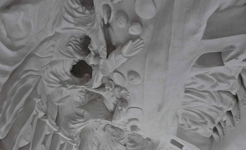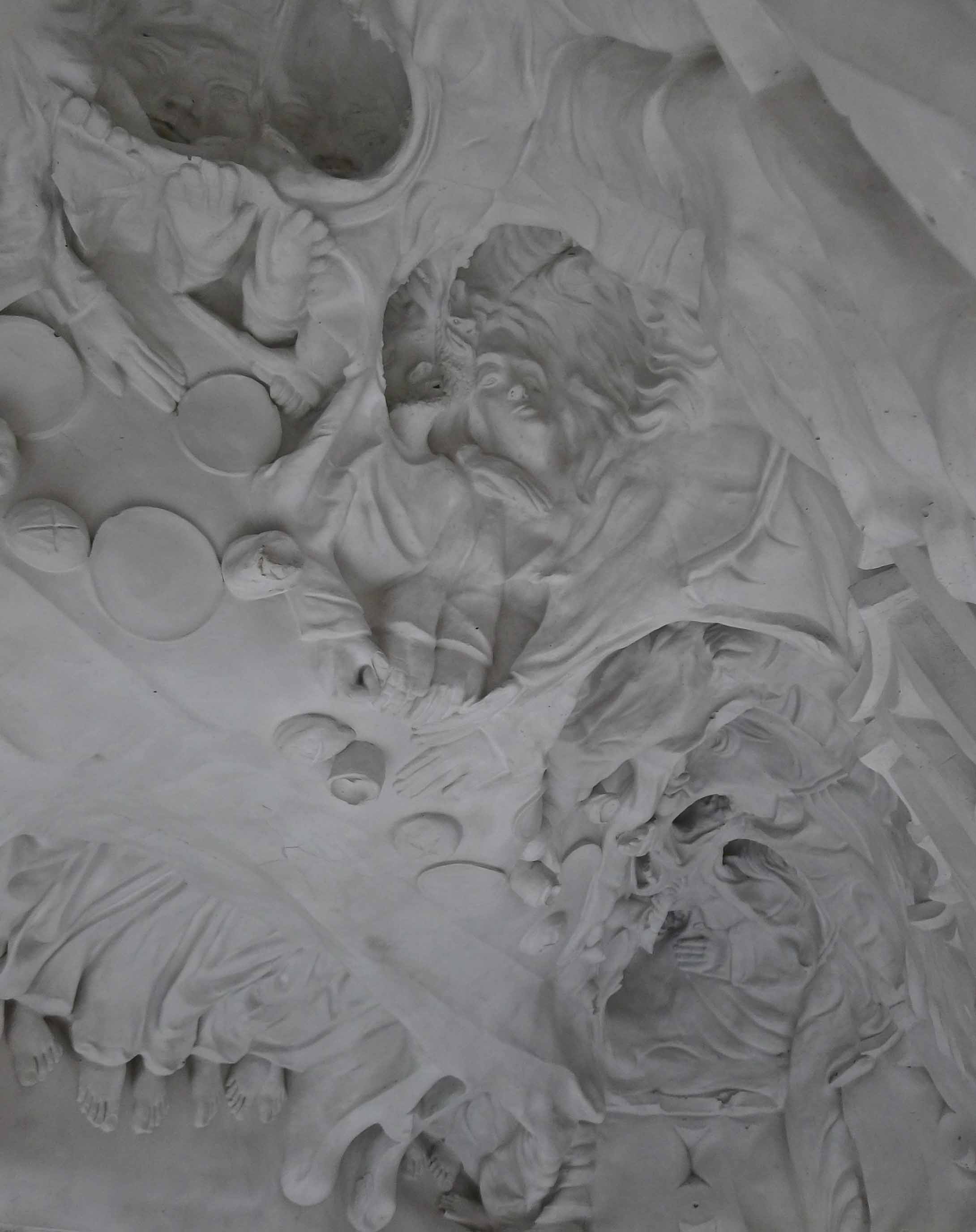 La scène religieuse bien connue de tous, Ultima Cena, a subi quelques modifications après manipulation. D’après une petite sculpture blanche de la Cène, sans qualité plastique aucune, vendue par un magasin de souvenirs, un modèle similaire mais agrandi à une échelle humaine a été réalisé avant d’être moulé. Il en résulte une pièce en négatif, un portrait de groupe complexe, présenté avec tous les défauts résultant d’un agrandissement qui n’aurait pas dû être fait, disposé nonchalamment sur le côté où des détails apparaissent en positif et permettent, mentalement, de saisir, par étapes, la référence iconographique qui a donné lieu à cette pièce.