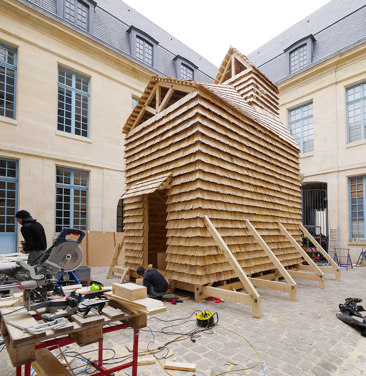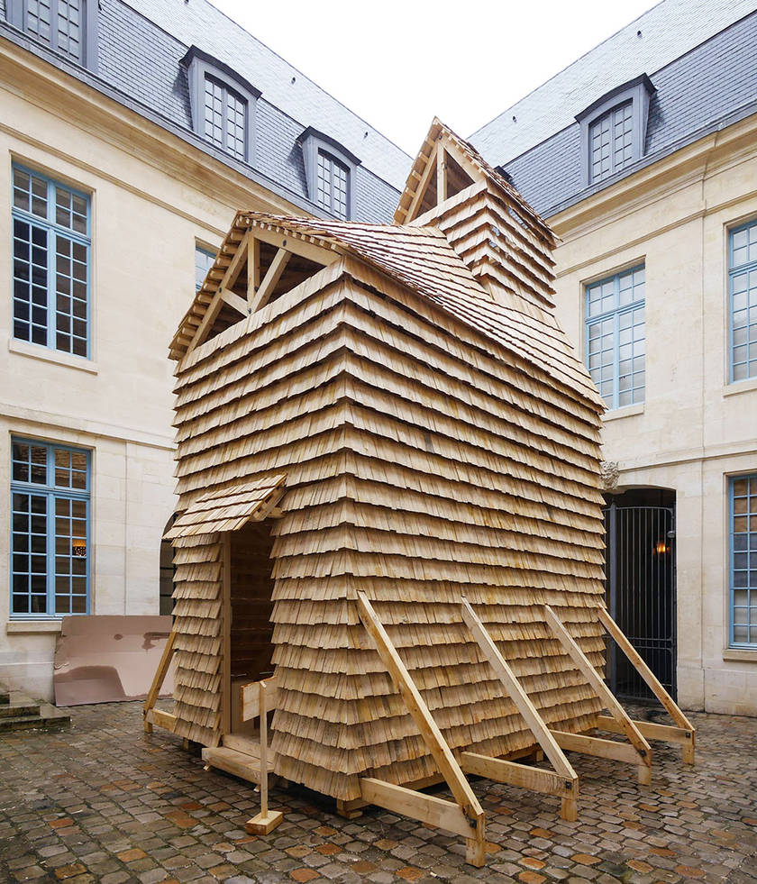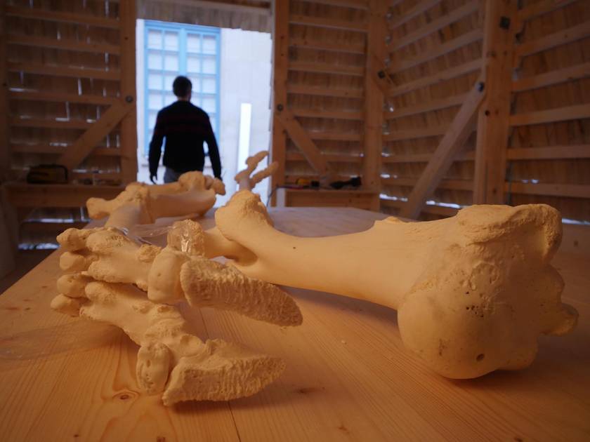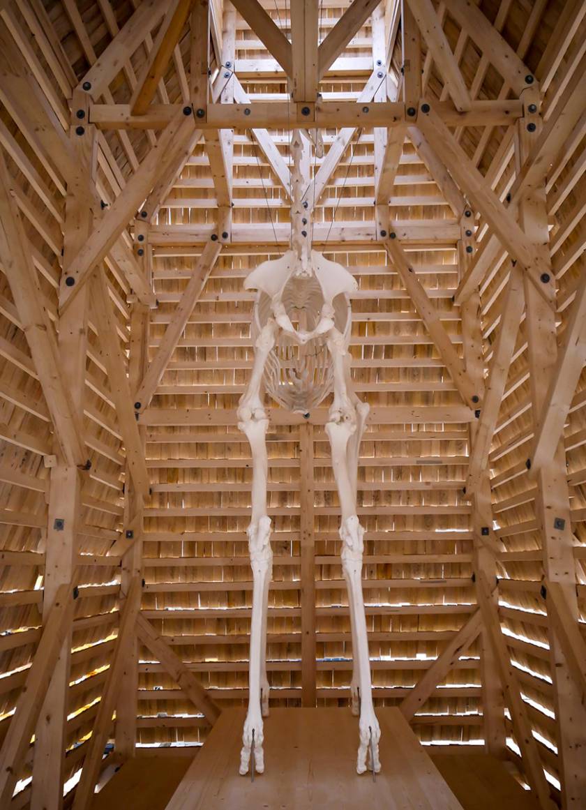 Une chapelle en bois de plus de 8 mètres de haut a été construite pour abriter un squelette de girafe. En entrant, on se retrouve entre la peau du bâtiment et les os de l“animal, dans une situation décalée où le spirituel côtoie le scientifique. On se sait qui de l“édifice ou de l“animal a pris la forme de l“autre.