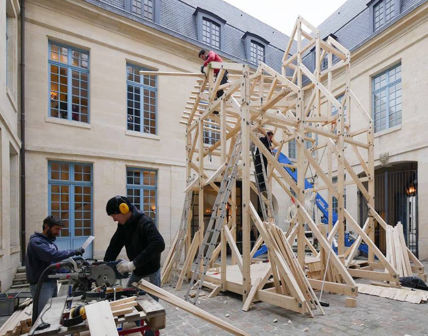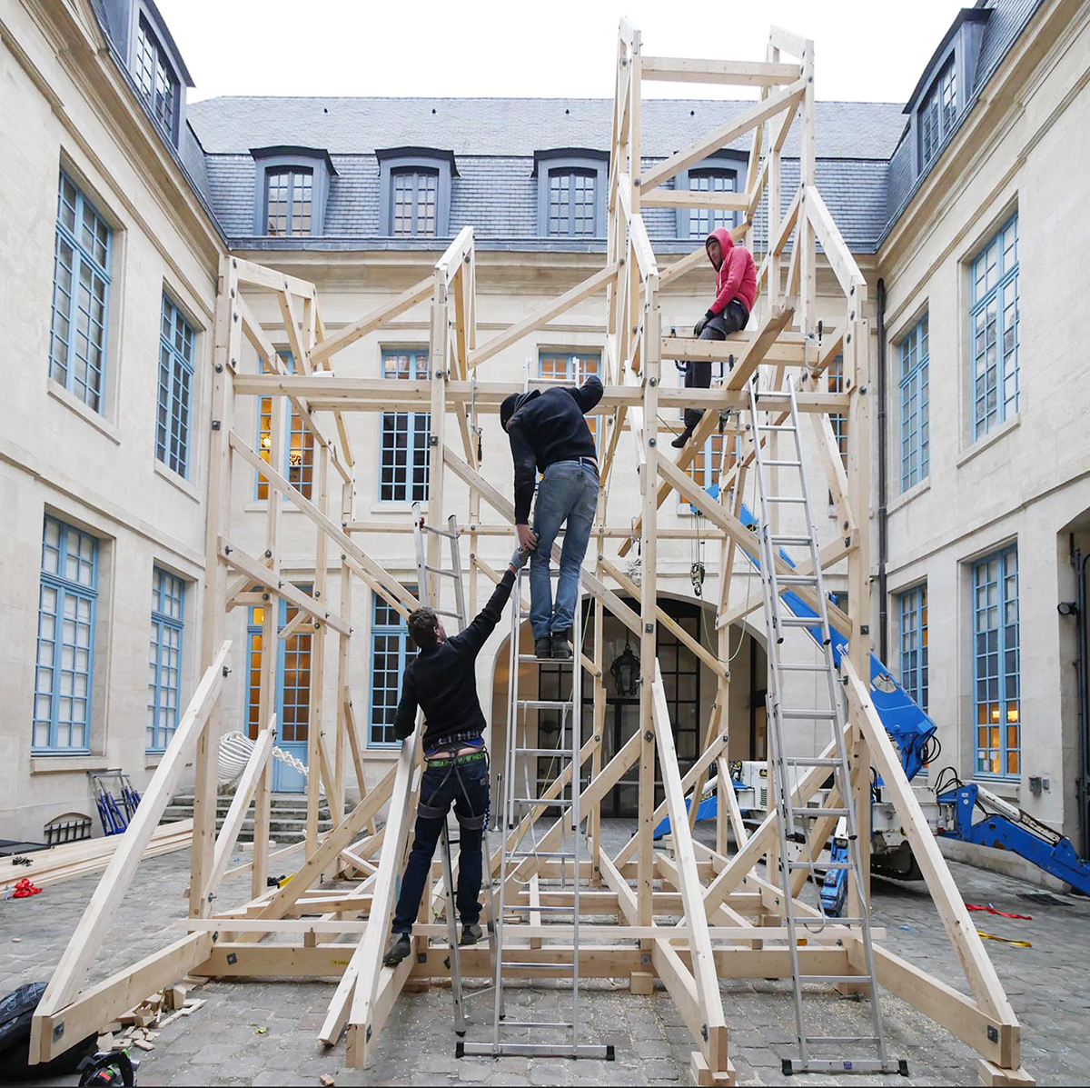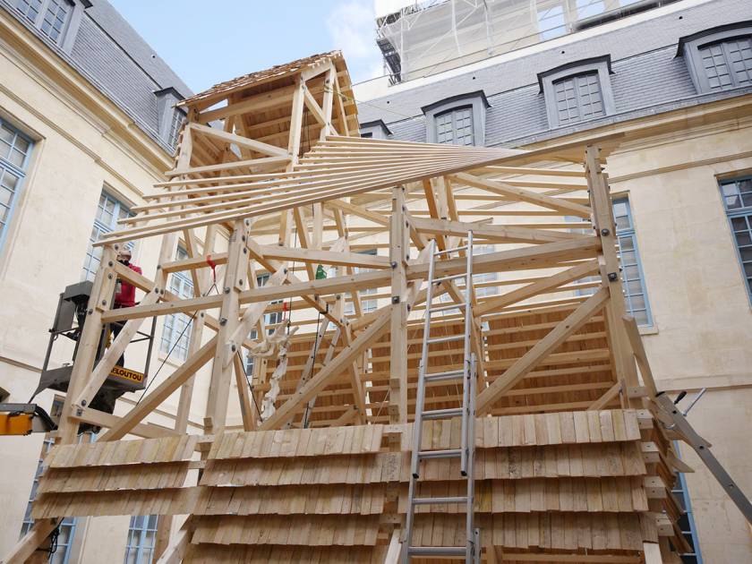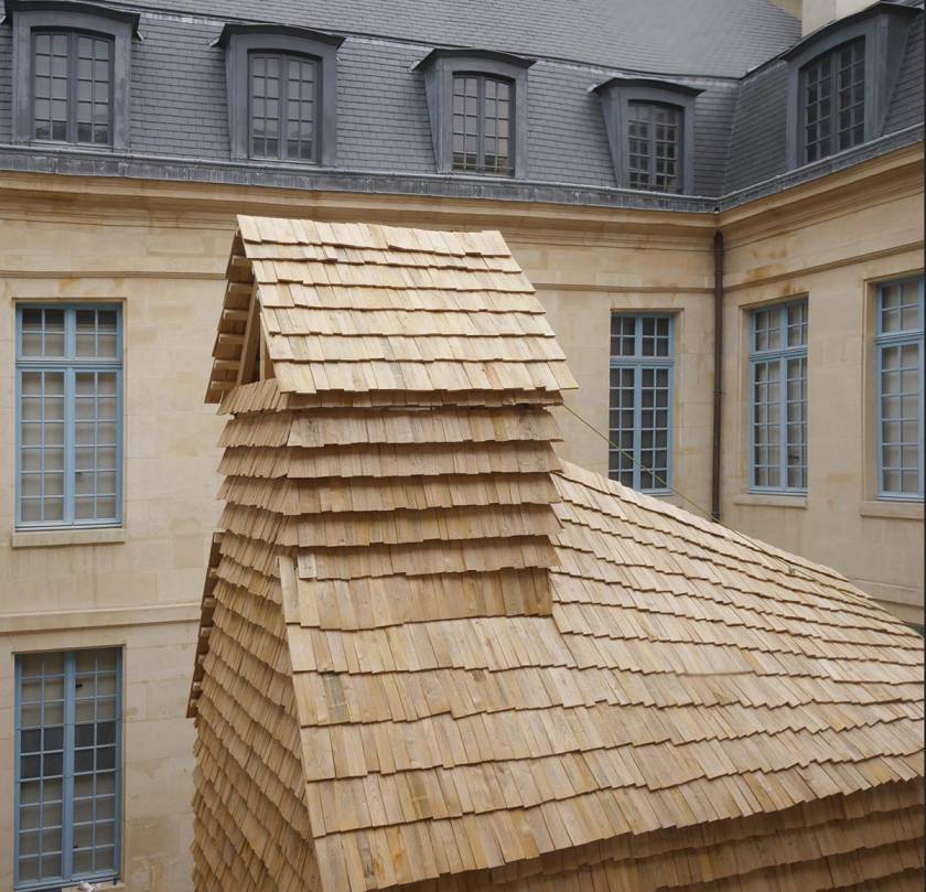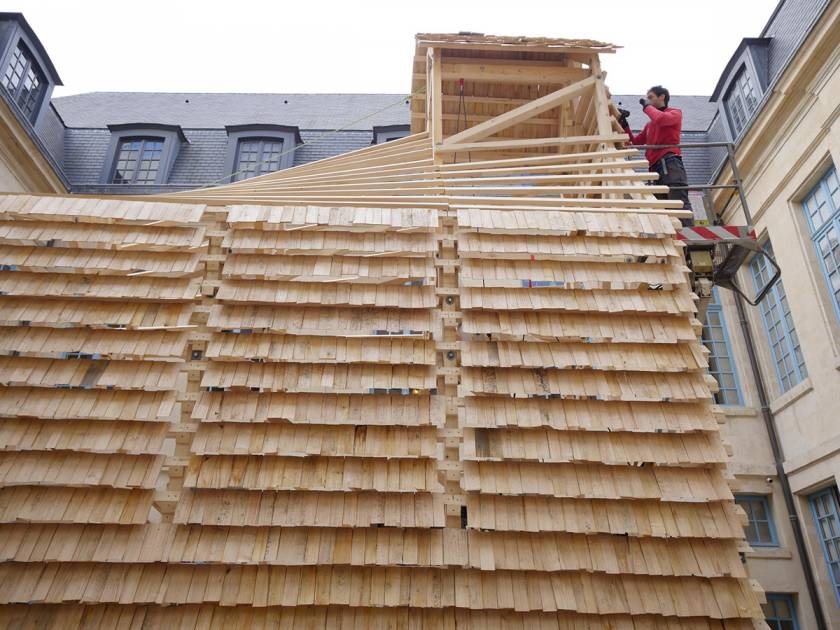 Une chapelle en bois de plus de 8 mètres de haut a été construite pour abriter un squelette de girafe. En entrant, on se retrouve entre la peau du bâtiment et les os de l“animal, dans une situation décalée où le spirituel côtoie le scientifique. On se sait qui de l“édifice ou de l“animal a pris la forme de l“autre.