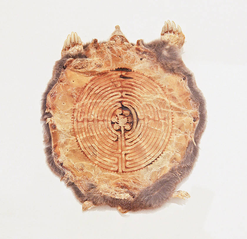 Connaissances du monde est une série de dessins gravés sur des peaux de petits mammifères : écureuil, putois, martre, fouine, opossum prêtent leur intérieur pour y dessiner des schémas d’ordre technique, qui ne sont pas sans lien avec ce que ces petits animaux représentent à nos yeux. Ainsi, l’on découvre un ventilateur tatoué dans la peau du putois, une roue dans celle de la souris ou un réseau labyrinthique pour « pacman » dans celle d’une taupe. Et si, en retournant la peau de tout un chacun, nous trouvions des tatouages, quels seraient-ils?