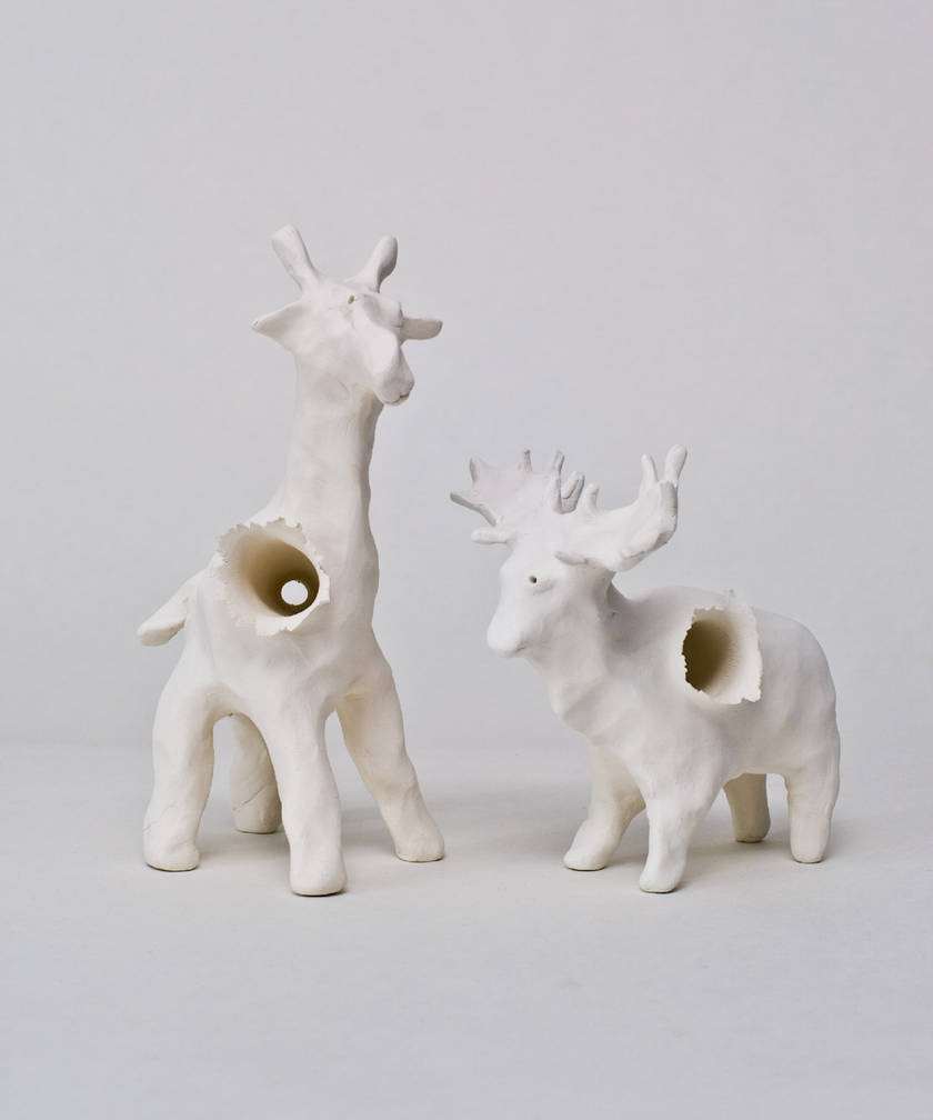 Une série de figurines en argile modelées de façon enfantine, puis traversées d'une balle de carabine. La candeur du modelage accentue la violence de l'impact presque chirurgical dans la terre meuble. Des statuettes animalières en terre cuite de facture similaires ont été datées du néolithique, servant probablement à des rituels de chasse. Celle-ci, contemporaines, seraient plutôt des bibelots pour la chasse depuis son sofa.