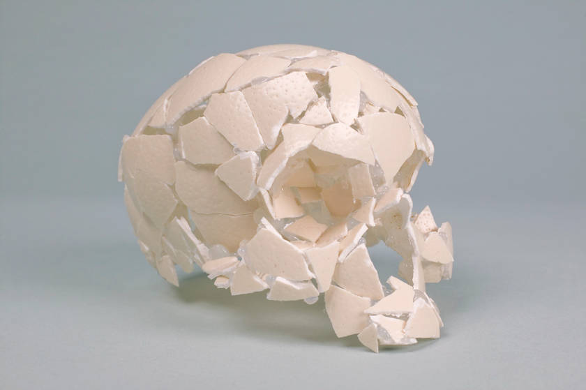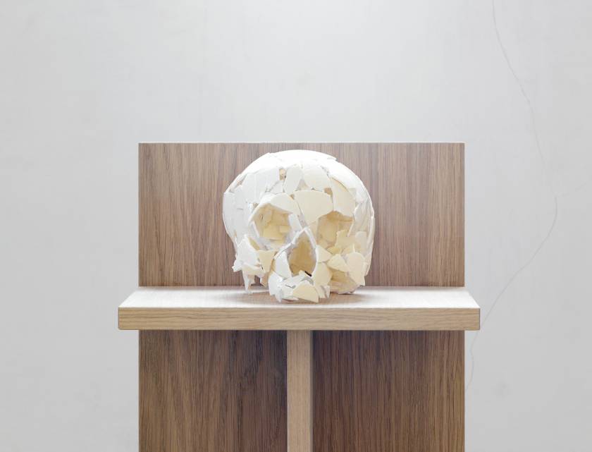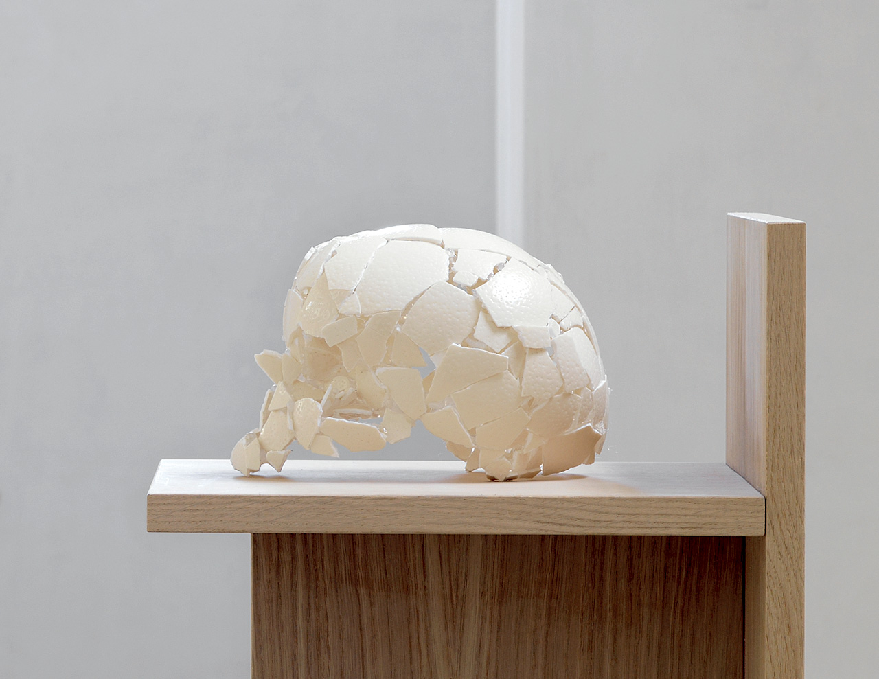 Un crâne humain est reconstitué en trois dimensions à partir d’un œuf d’autruche. L’idée de rapprocher un œuf, objet emblématique du début de la vie, avec un crâne, symbolisant la fin de l’existence, s’est imposée rapidement au vu des similitudes de matière, de volume et de couleur. Il a fallu pourtant briser l’œuf avant de reconstituer – dans un équilibre précaire – l’image d’un crâne. La fragilité de l’opération et son résultat entrent en parfaite adéquation avec le thème de la vanité.