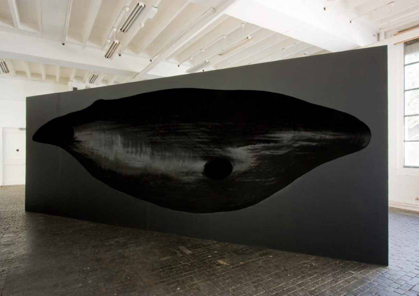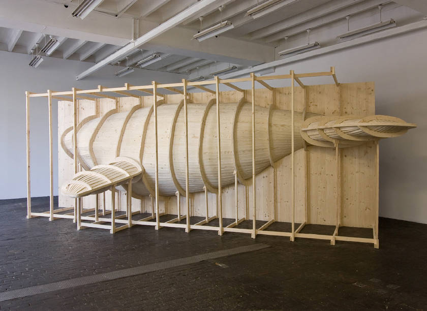Hval – mot scandinave pour désigner la baleine – est une installation tridimensionnelle proche d’une construction navale savamment échafaudée. Constituée principalement de vide, celui laissé par le corps de la baleine disparue, cette sculpture monumentale joue sur l’opposition entre la construction navale géométrique de bois clair et le trou noir plus organique – qui, par ailleurs s’avère être une expérience visuelle forte – représentant le cétacé. Peu de limites séparent ici le bateau de sa proie.