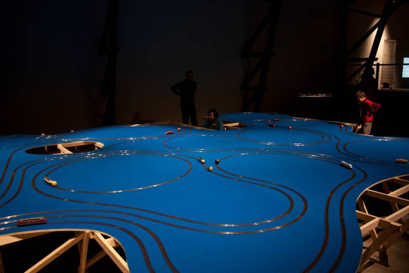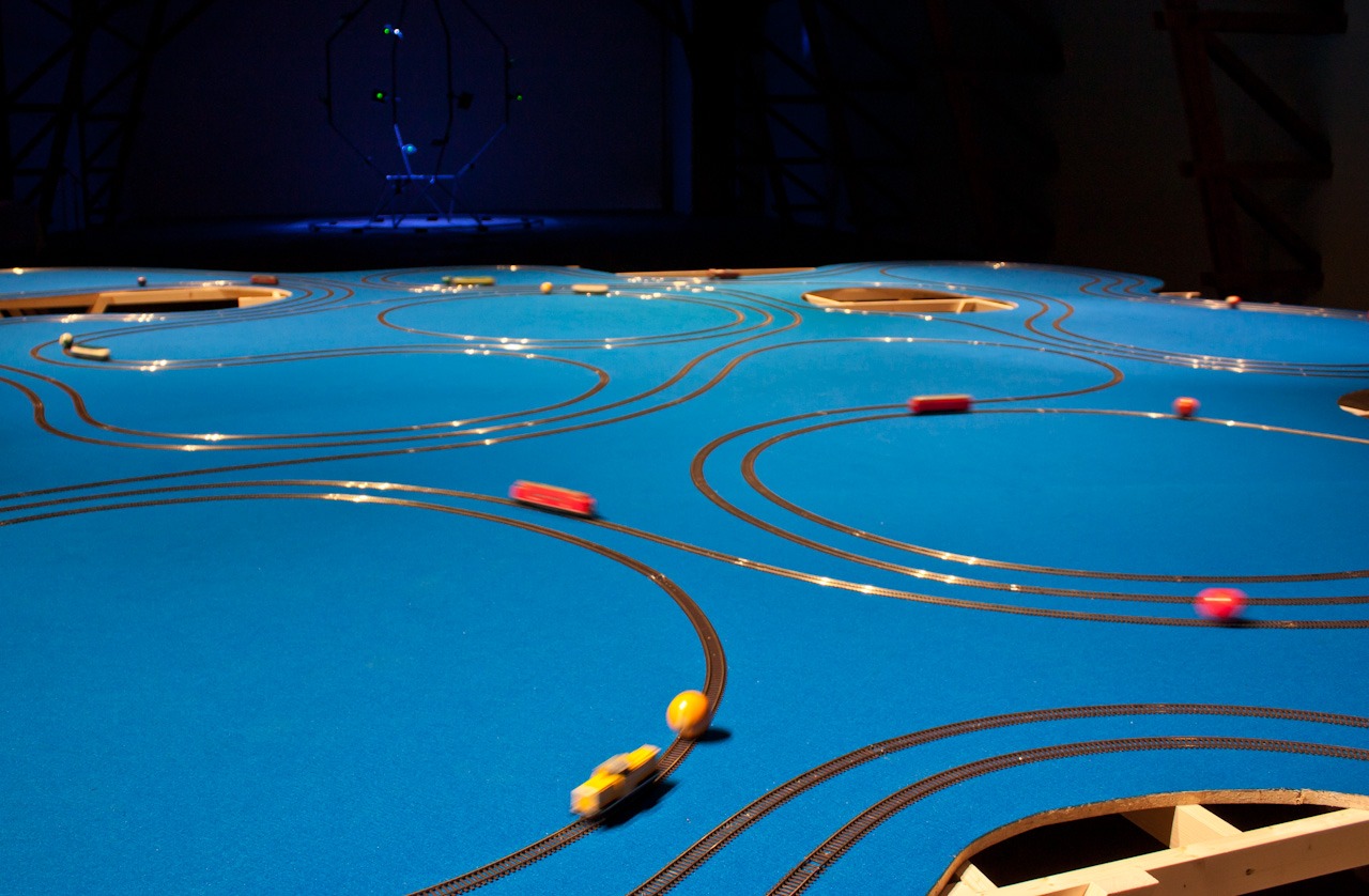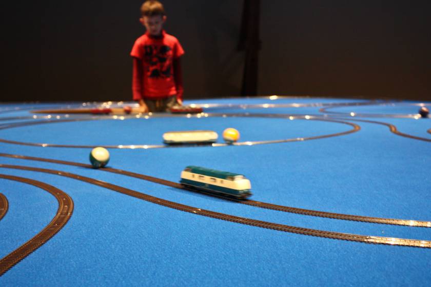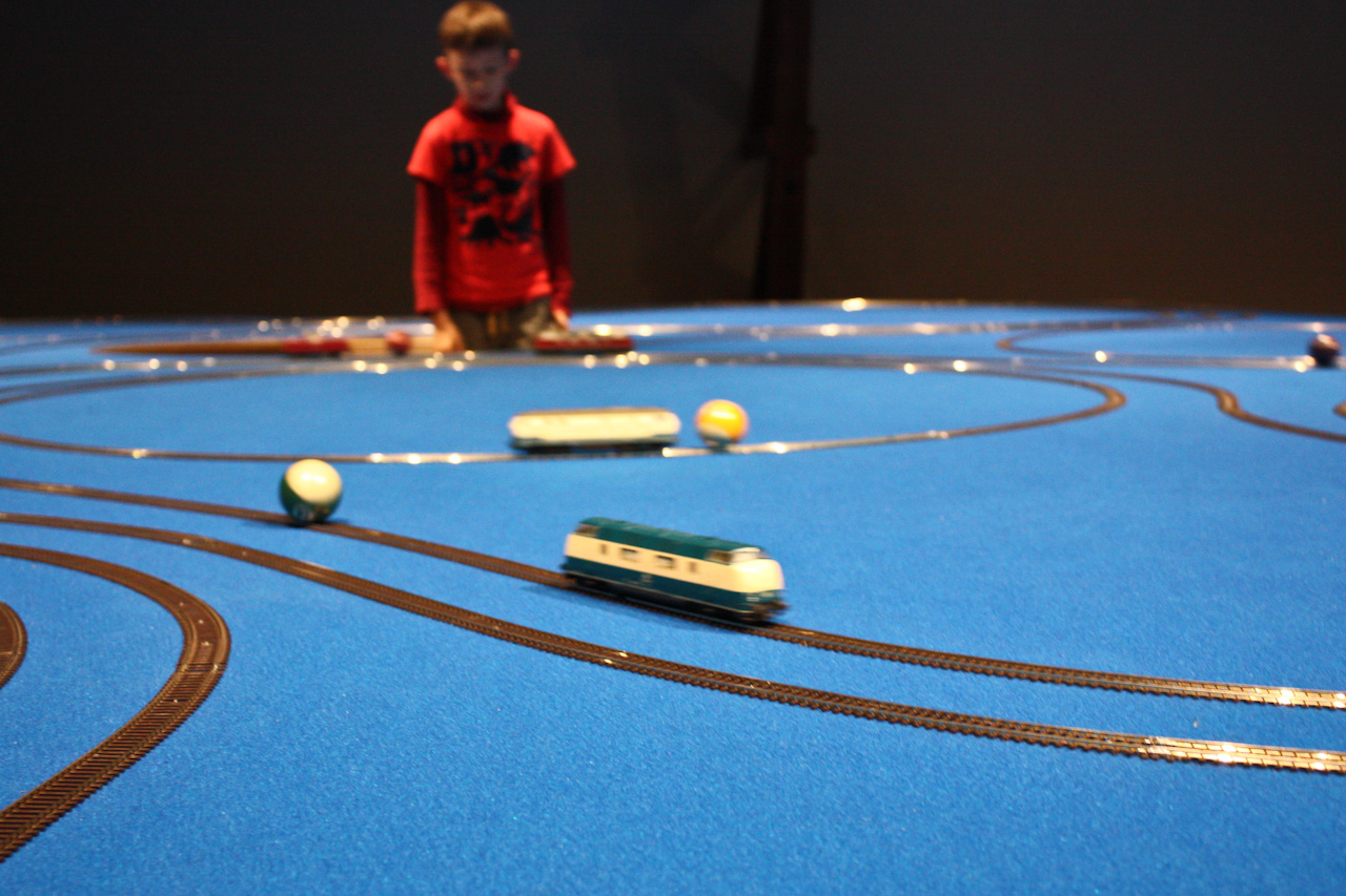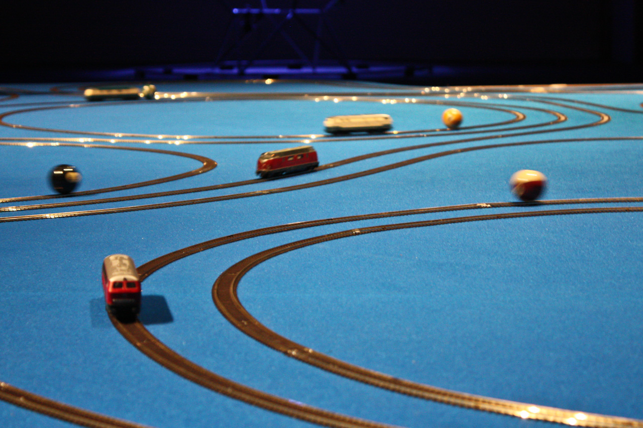 Le Momentum – autrement dit le mouvement des particules – est représenté dans ce dispositif par une douzaine de circuits de trains électriques. Avec des couleurs assorties entre elles et se référant au jeu du billard, chaque locomotive pousse une boule. Il en résulte un effet hypnotique du fait des courses poursuites qui se créent entre les locomotives et leur balle. Une manière d’illustrer le mouvement des atomes qui interfèrent entre eux dans des entrelacs d’orbitales.