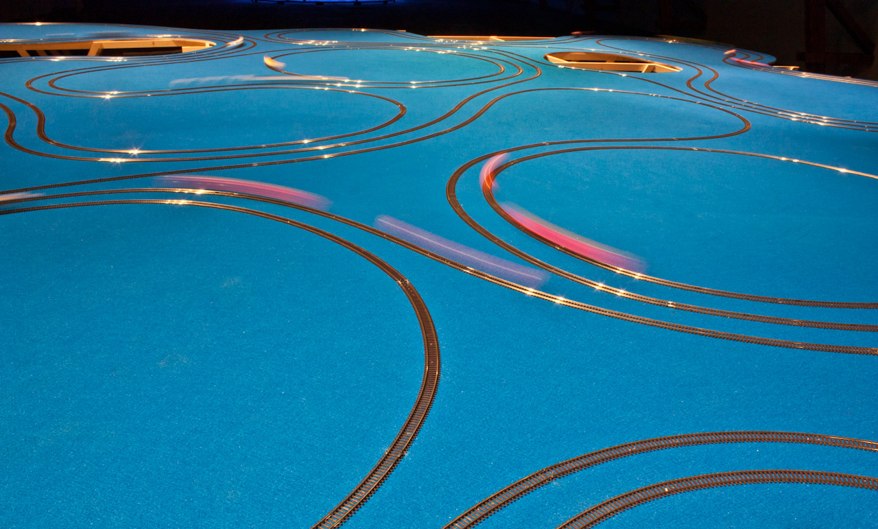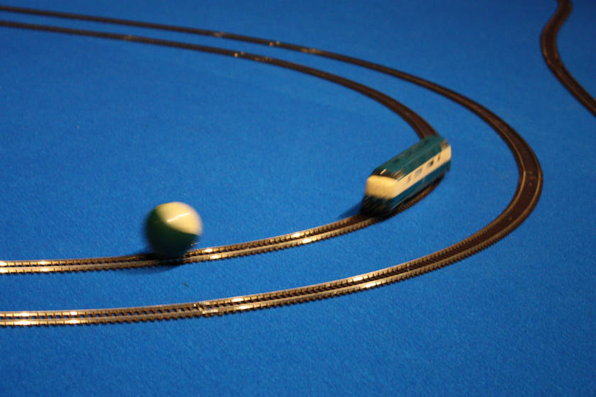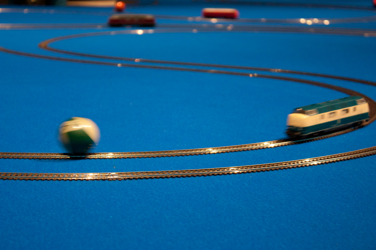 Bois, moquette, rails H0, locomotives, boules billard