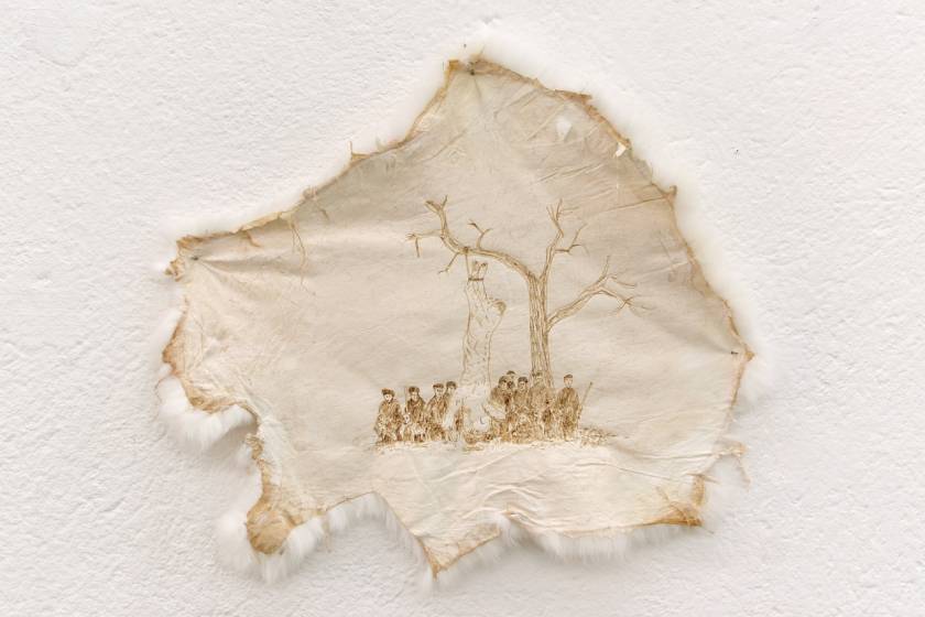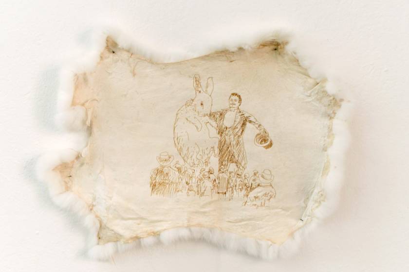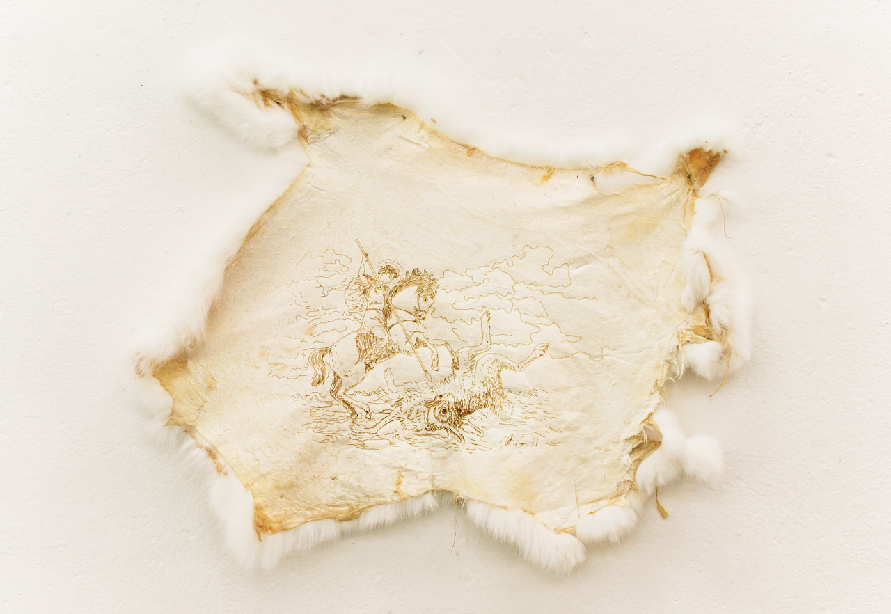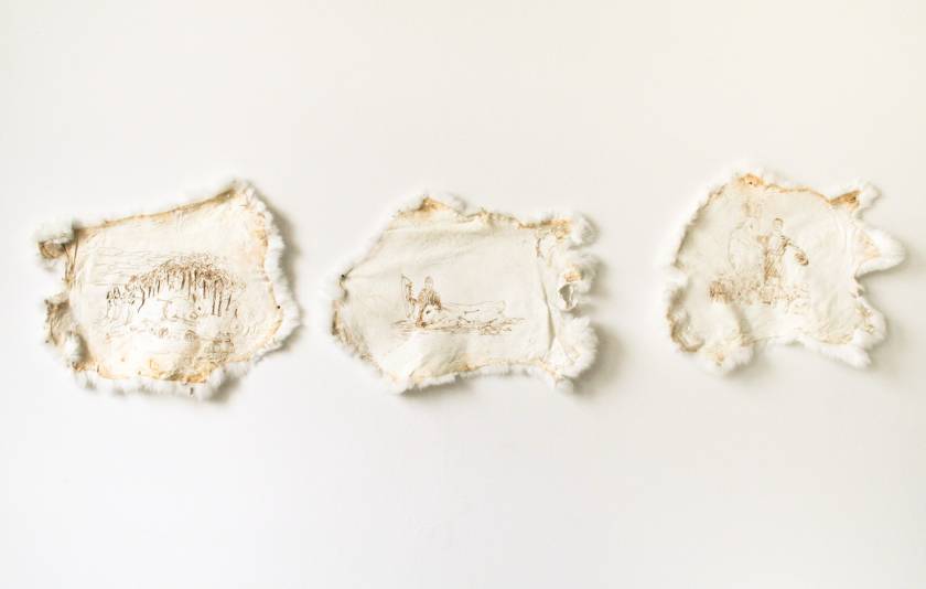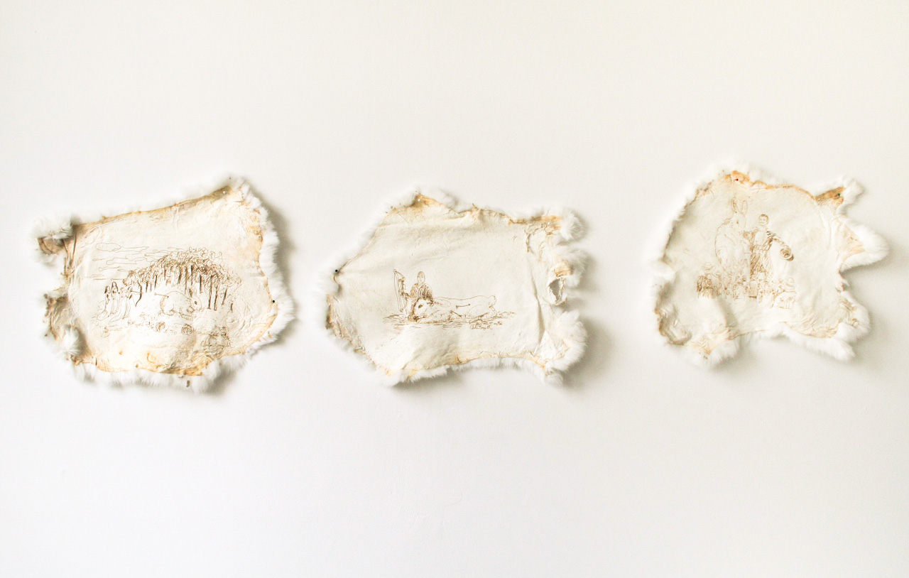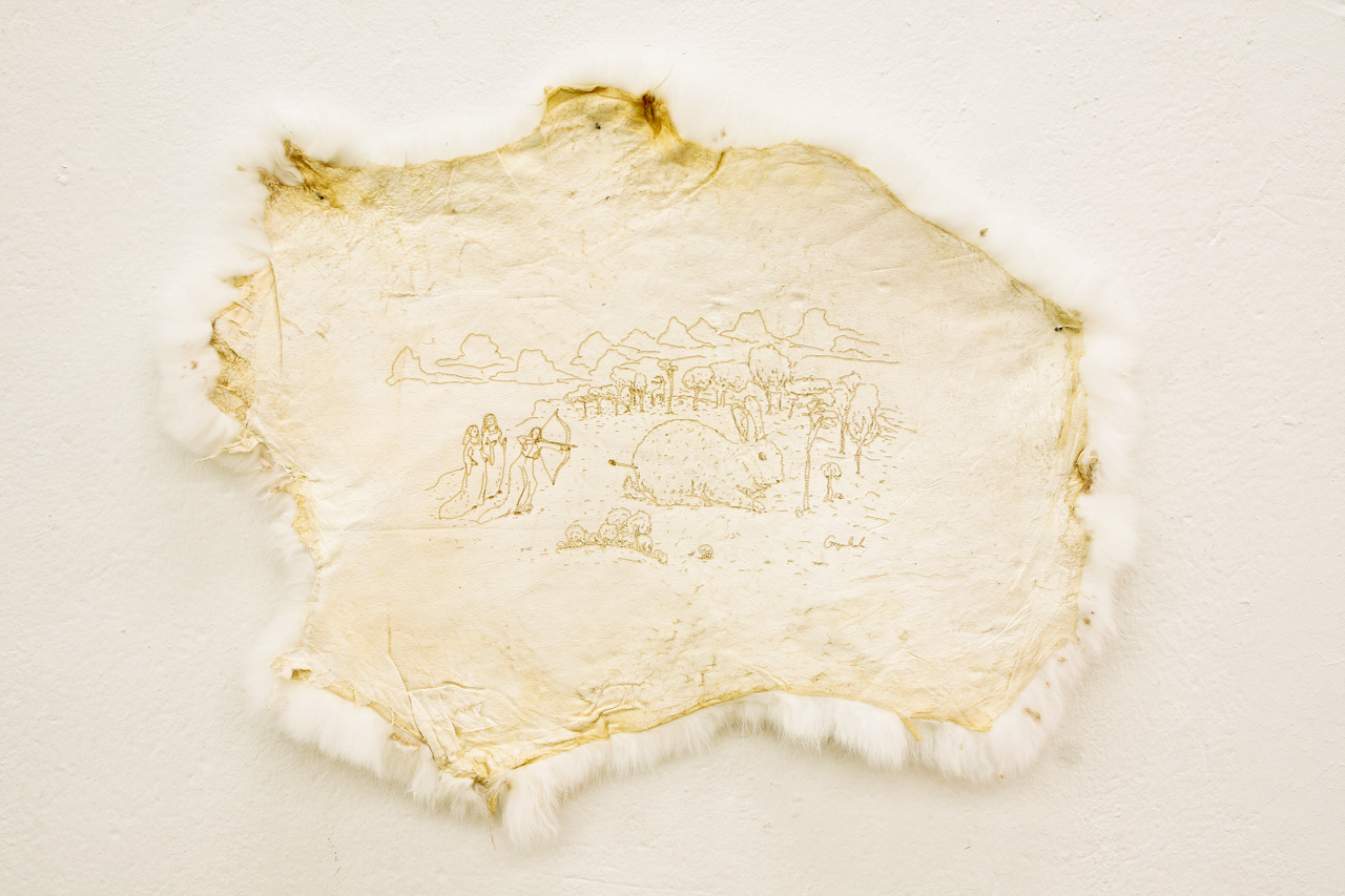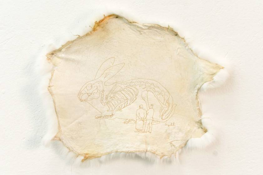 Skintales est une série de dessins gravés sur des peaux de lapin qui, comme tirés d’un conte, racontent les scènes de la vie d’un grand lapin. La narration se découvre comme autant de tatouages qui préexisteraient au dépeçage du gigantesque léporidé. Cette série est en effet indissociable du Great Stuffed Rabbit. Elle est présentée dans un accrochage linéaire et la fourrure blanche qui encadre les peaux contribue à leur donner un petit aspect aérien rêvé.