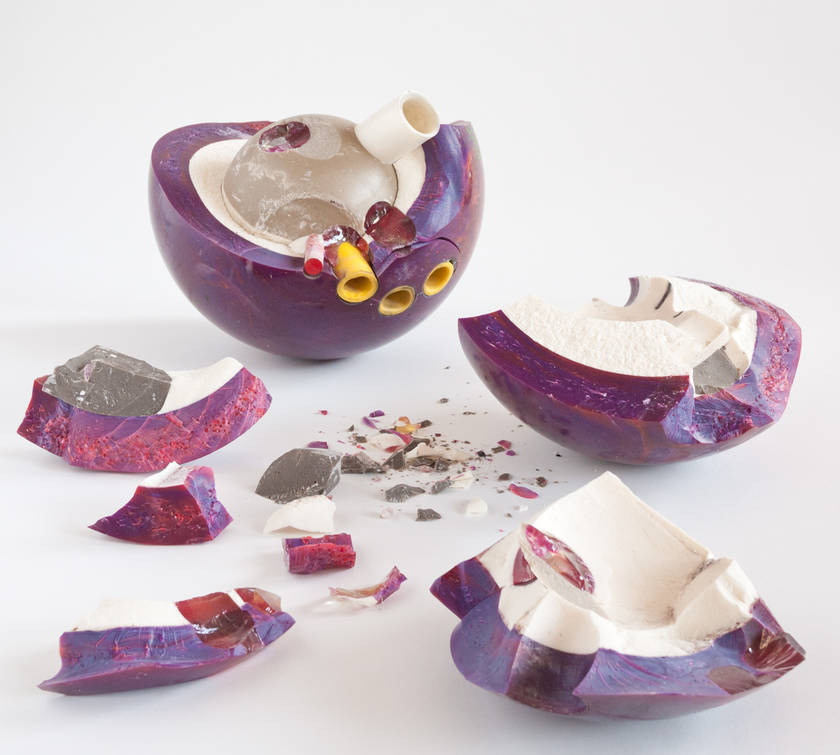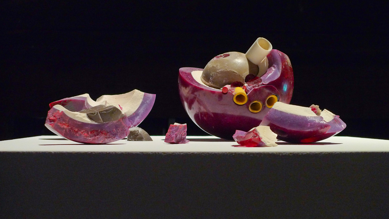 Si les physiciens s’attachent à ouvrir les particules, Gonzenbach a ouvert, non sans une certaine violence, une boule de bowling. Les prises pour les doigts prolongées en tuyaux semblent être des artères et les formes éclatées deviennent quasi organiques. La boule qui devrait « casser » le jeu de quilles est elle-même réduite à néant et perd son utilité.