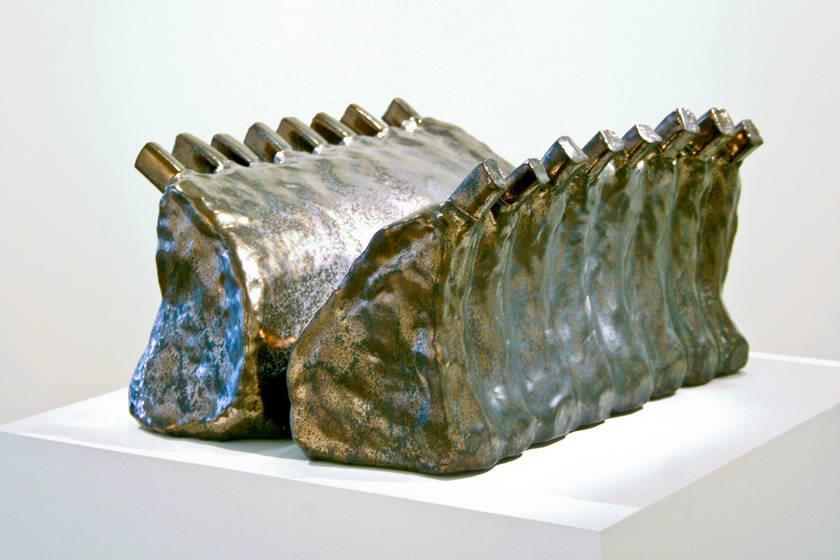 V16 est une pièce hybride qui fait le lien entre le mangeur de viande que nous sommes et le conducteur de voiture de sport puisqu’il est constitué de seize côtes de porc. Le choix de l’animal n’est sans doute pas destitué d’ironie pour présenter un lieu commun entre deux aspects de notre espèce humaine.